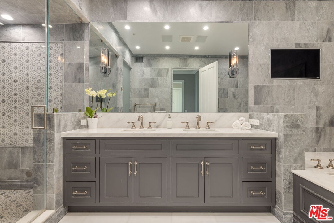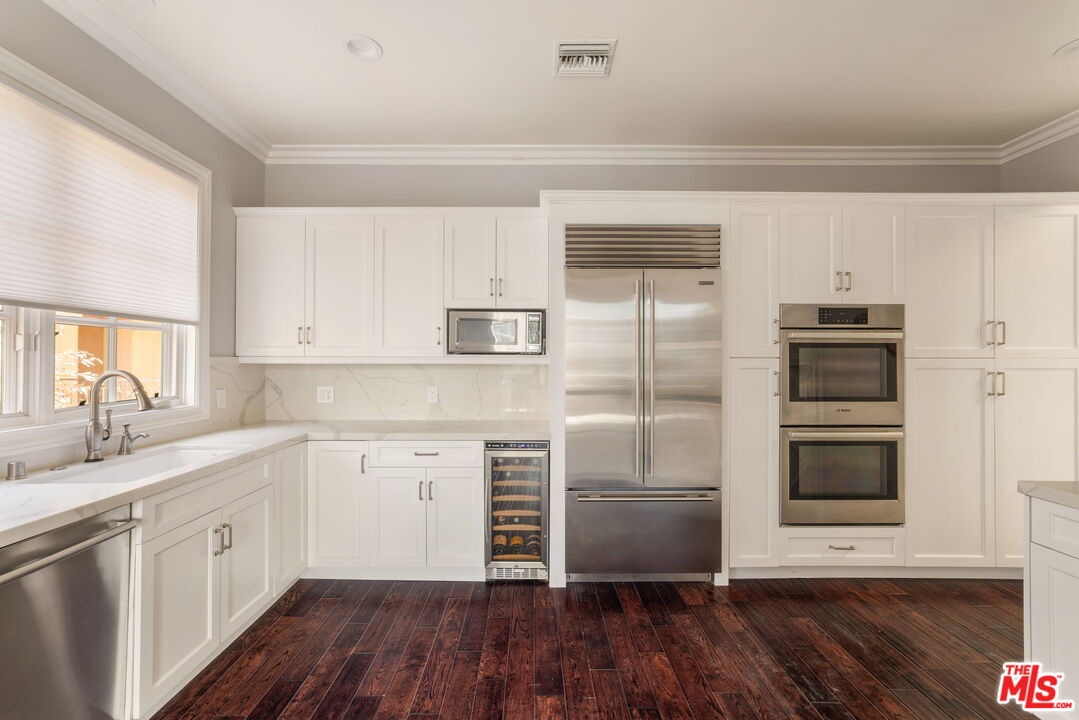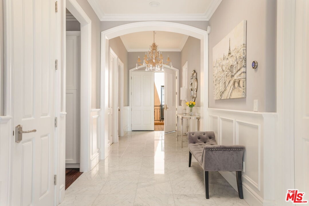 Perched on the penthouse level of Brentwood's premier full-service community, this exquisite corner residence redefines luxury living with unparalleled privacy--no shared walls--and sweeping city views. Soaring high ceilings and expansive windows fill the home with radiant natural light, while every detail has been meticulously remodeled with top-of-the-line finishes, from the upgraded kitchen and primary bathroom to the elegant wood wainscoting, crown molding, and archways and sleek new flooring throughout. A marble-tiled foyer with skylight and double doors sets a grand first impression, leading into the open-concept living and dining room featuring two private balconies, a decorative fireplace, and a wet bar ideal for entertaining. The gourmet kitchen is a dream, outfitted with stone countertops, custom pantry storage, a sunlit breakfast nook, and premium Subzero, Viking, and Bosch appliances, including double ovens, a gas range, and a wine refrigerator. The grand primary suite is a personal sanctuary, offering high ceilings, its own balcony, a custom walk-in closet, and a spa-inspired ensuite clad in marble with heated floors, a ThermaSol steam shower, and jetted soaking tub. A spacious secondary bedroom with ensuite bath provides comfort and privacy for guests, while the laundry room with sink and storage adds everyday convenience. Additional upgrades include the new AC unit and SubZero refrigerator. This home includes three parking spaces in the secure garage plus two additional storage lockers. Residents of this coveted community enjoy unrivaled amenities including a doorman, concierge, valet parking, rooftop pool, spa and sundeck, fitness center, banquet hall, and more. Supremely located in the heart of Brentwood, moments from upscale dining, boutique shopping, and the Brentwood Country Club--and just a short drive to the beach--this penthouse residence offers the ultimate blend of sophistication, comfort, and convenience.