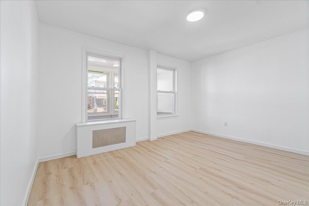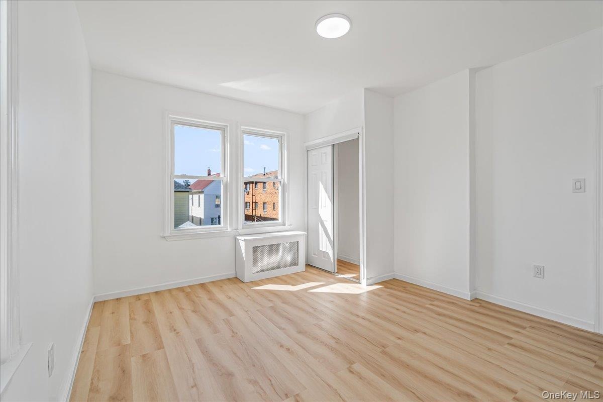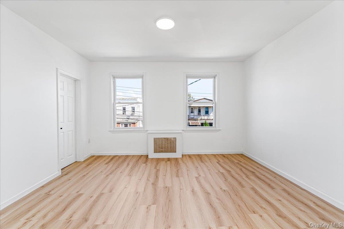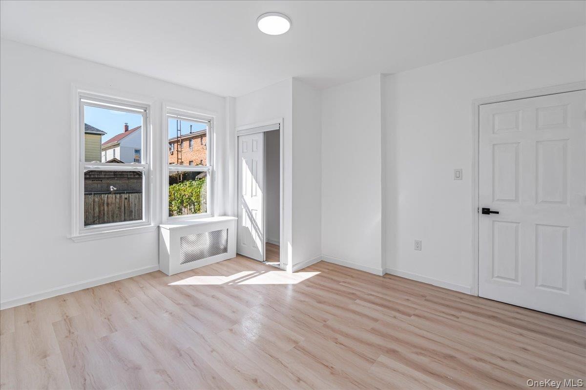 - Unfurnished room featuring light wood finished floors and radiator heating unit