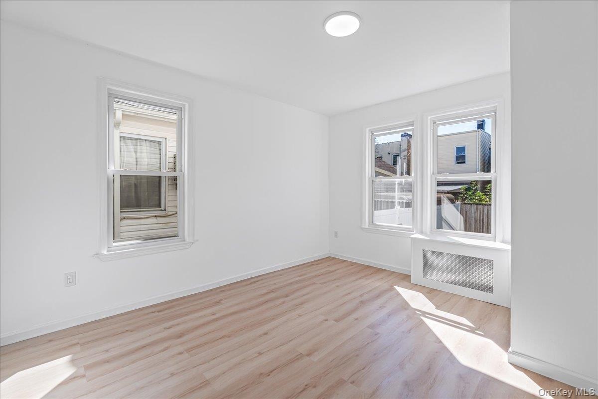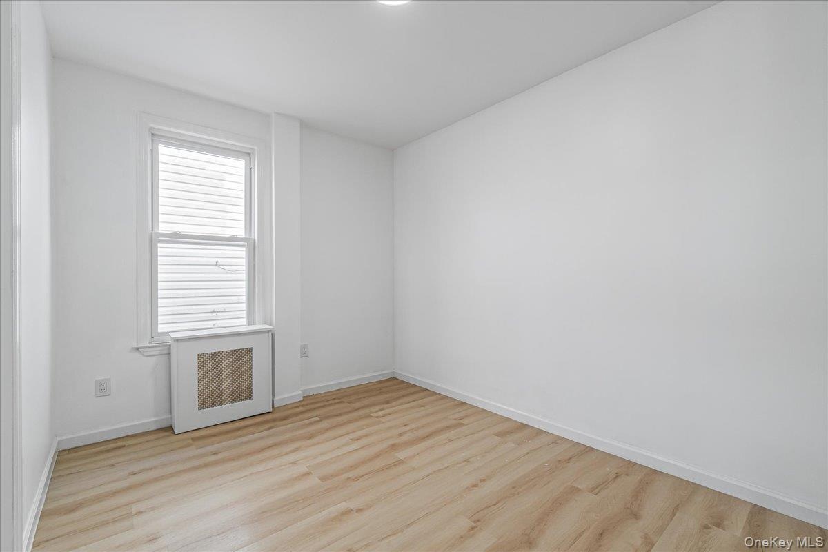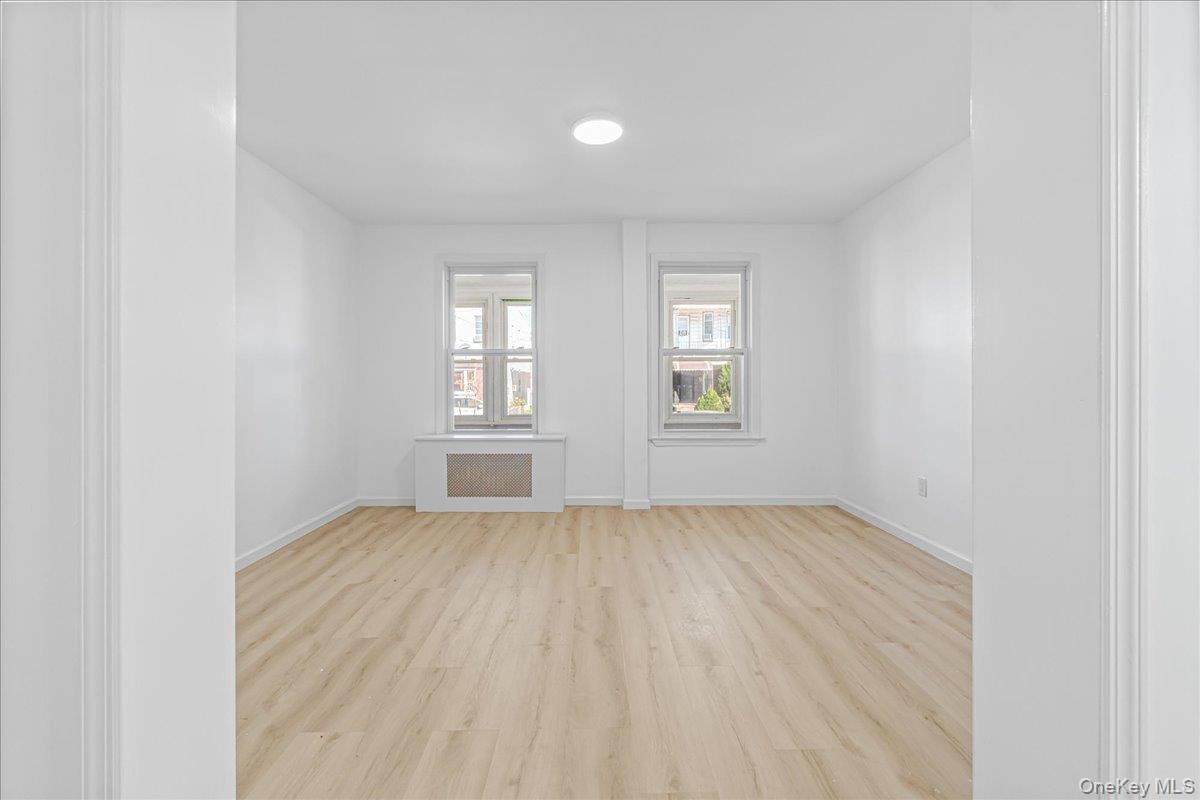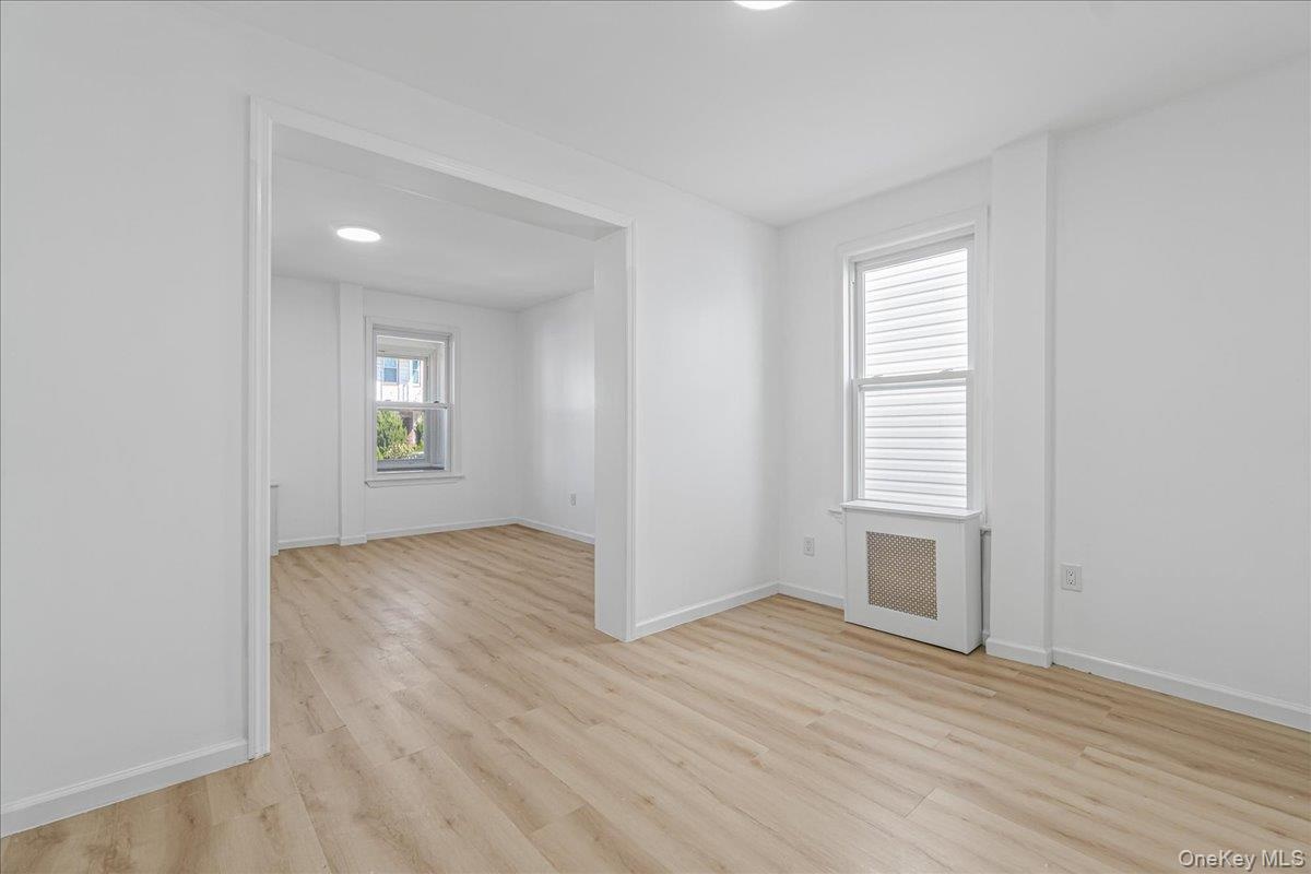 - Unfurnished room featuring light wood finished floors and radiator heating unit