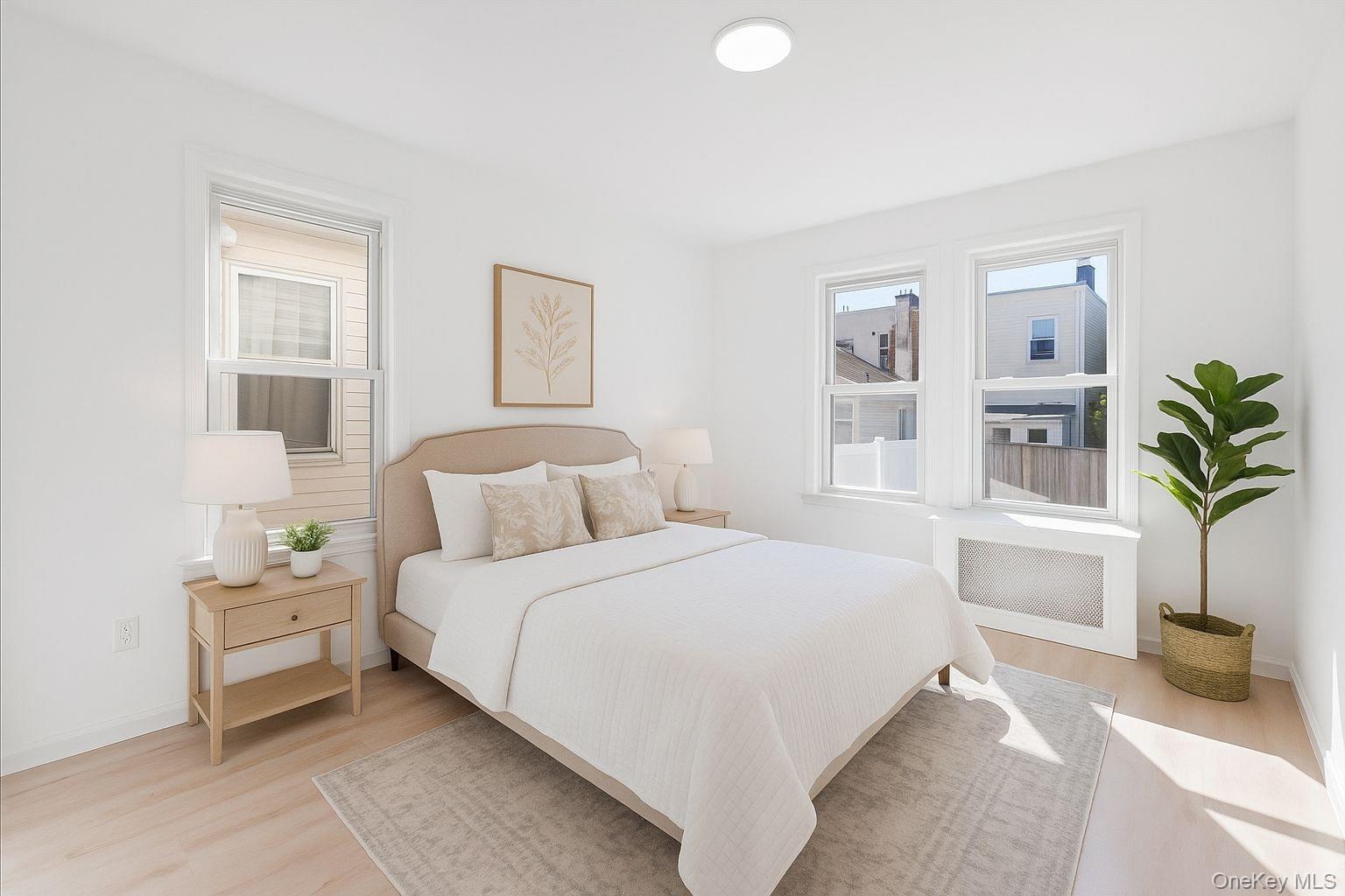 - Unfurnished room featuring radiator heating unit and light wood-style flooring