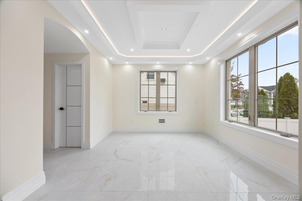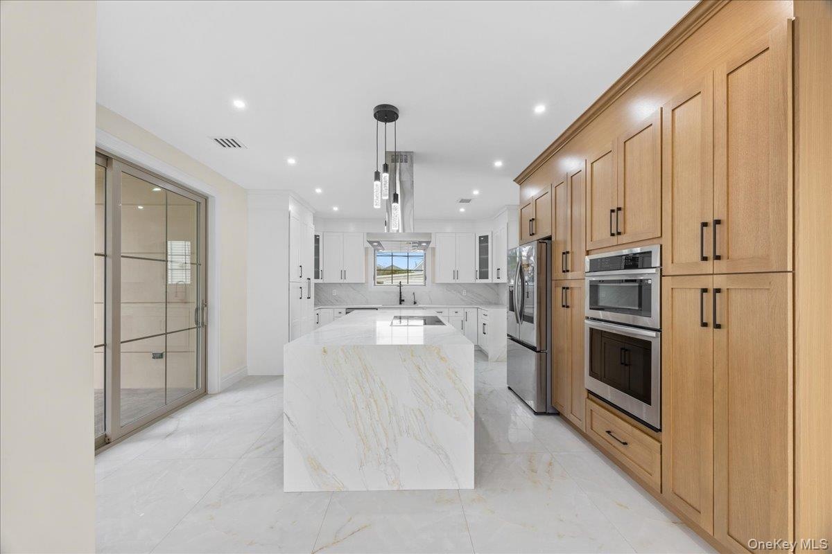 A true chef’s dream, the property includes two kitchens—a full kitchen and a separate spice kitchen—both featuring quartz countertops, custom cabinetry, and high-end stainless steel appliances. The formal dining room is perfect for hosting gatherings and special occasions, seamlessly connecting to the open living and kitchen areas.