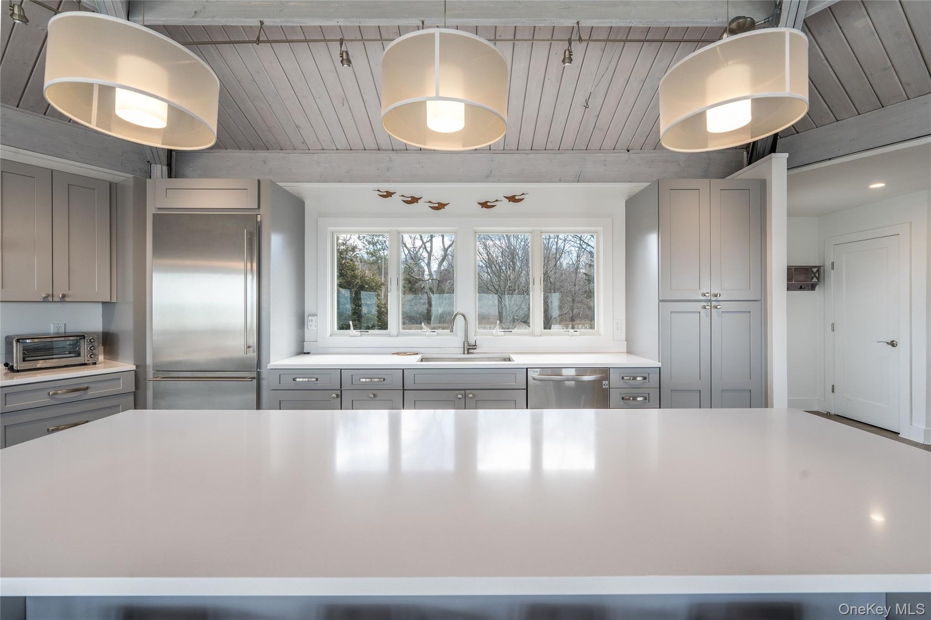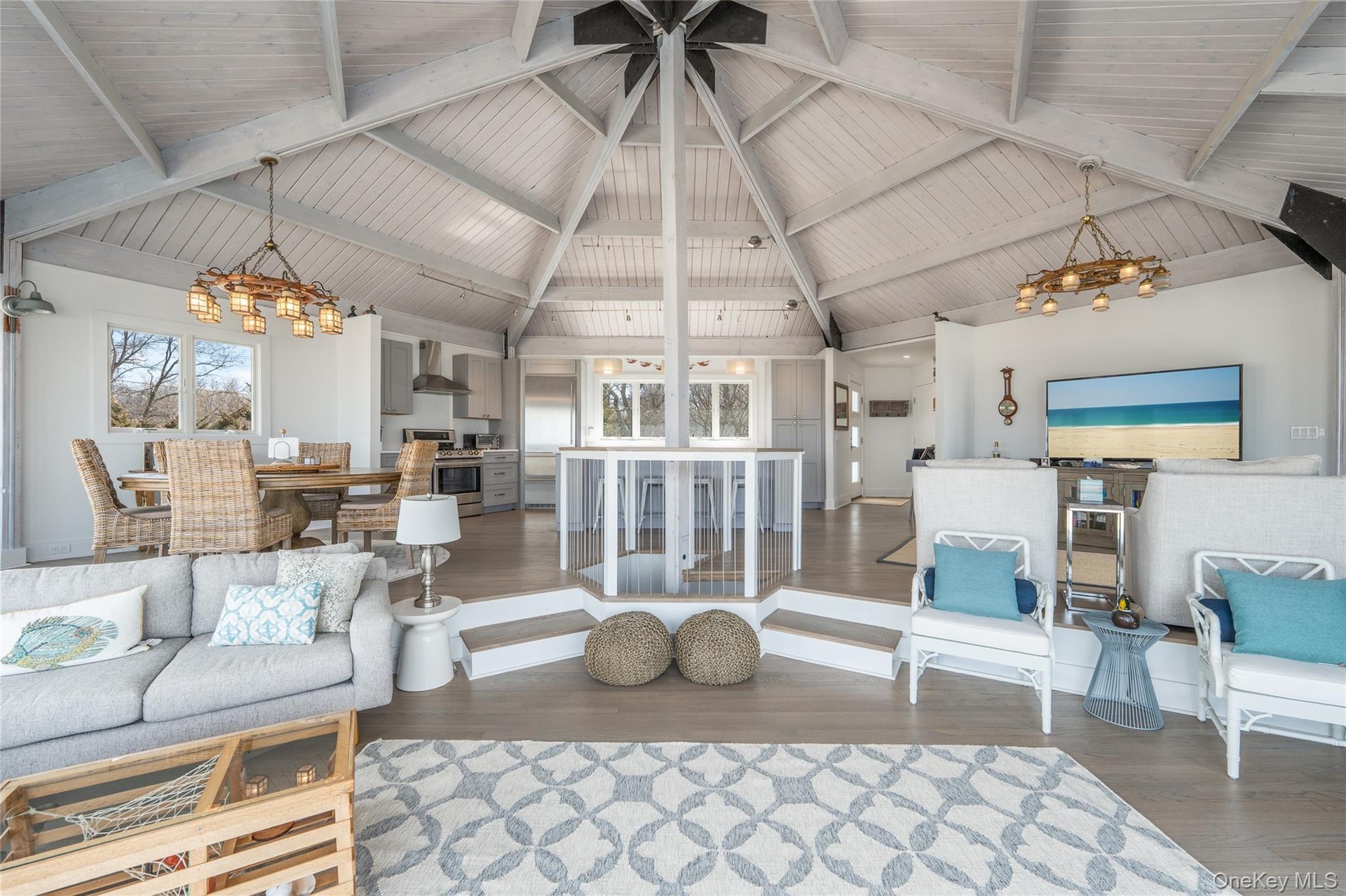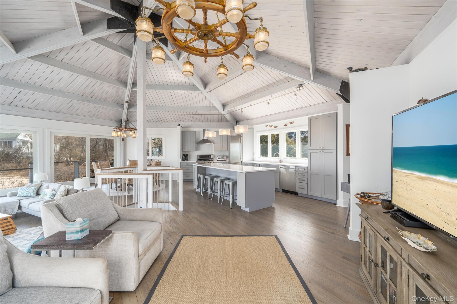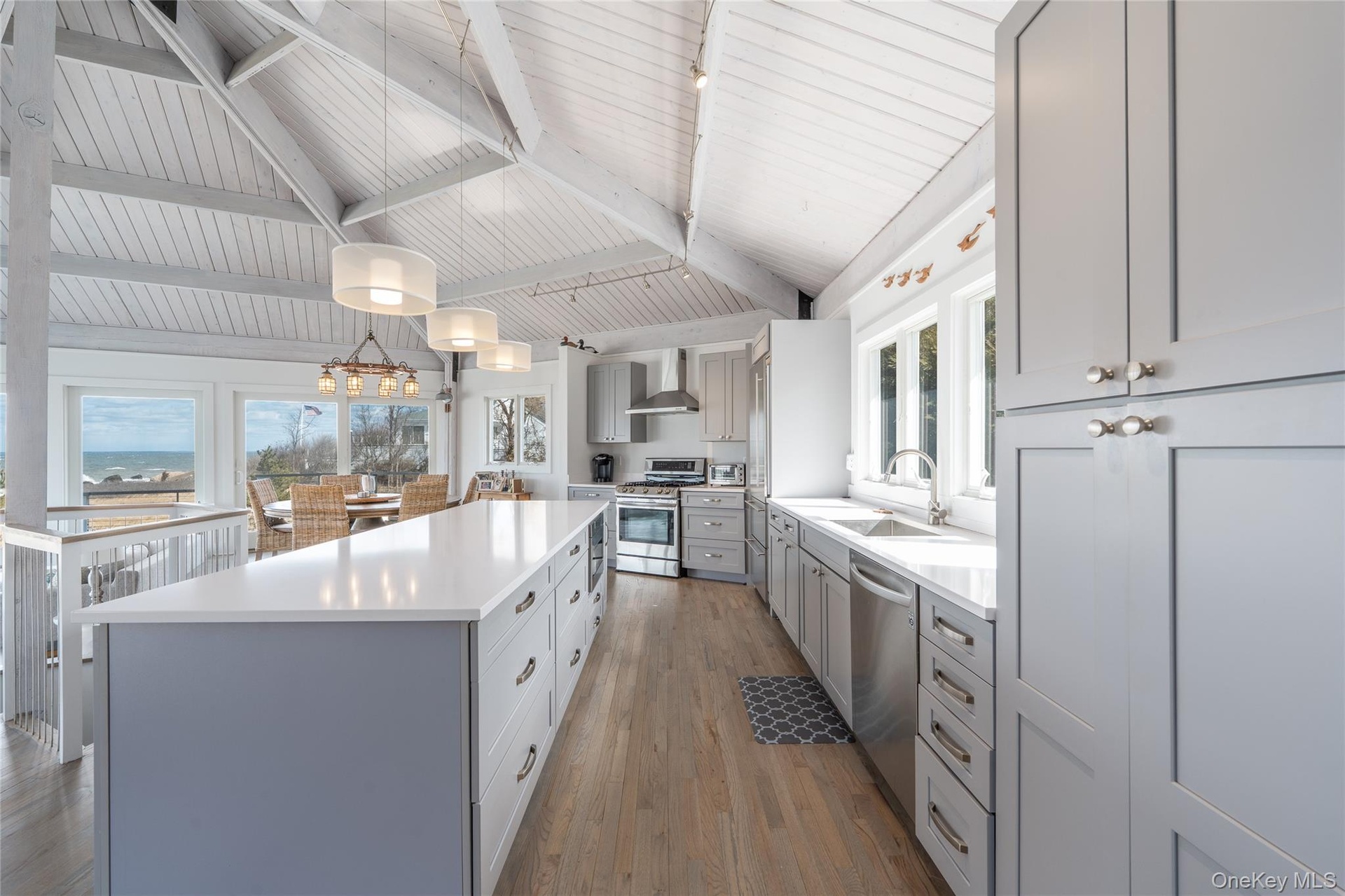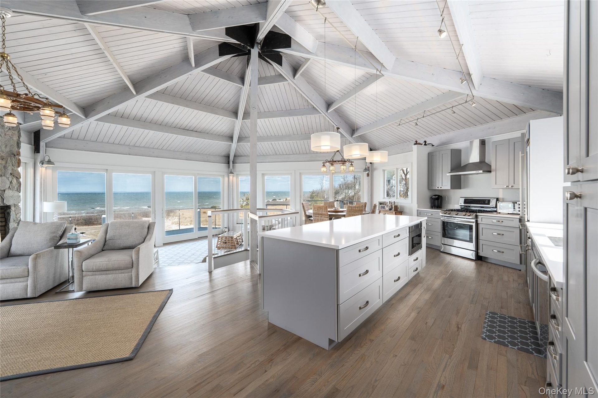- Kitchen featuring lofted ceiling with beams, hanging light fixtures, plenty of natural light, and open floor plan