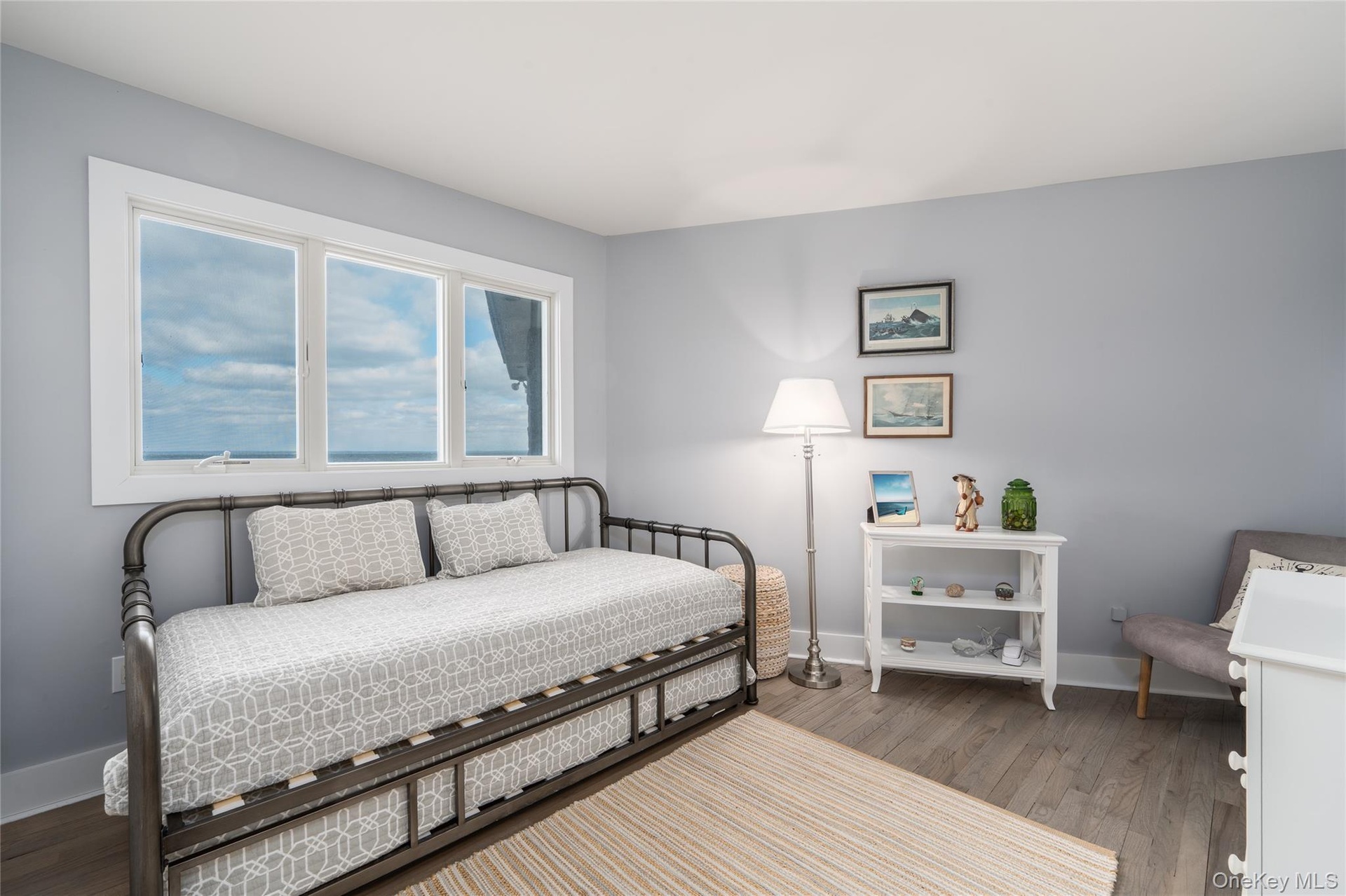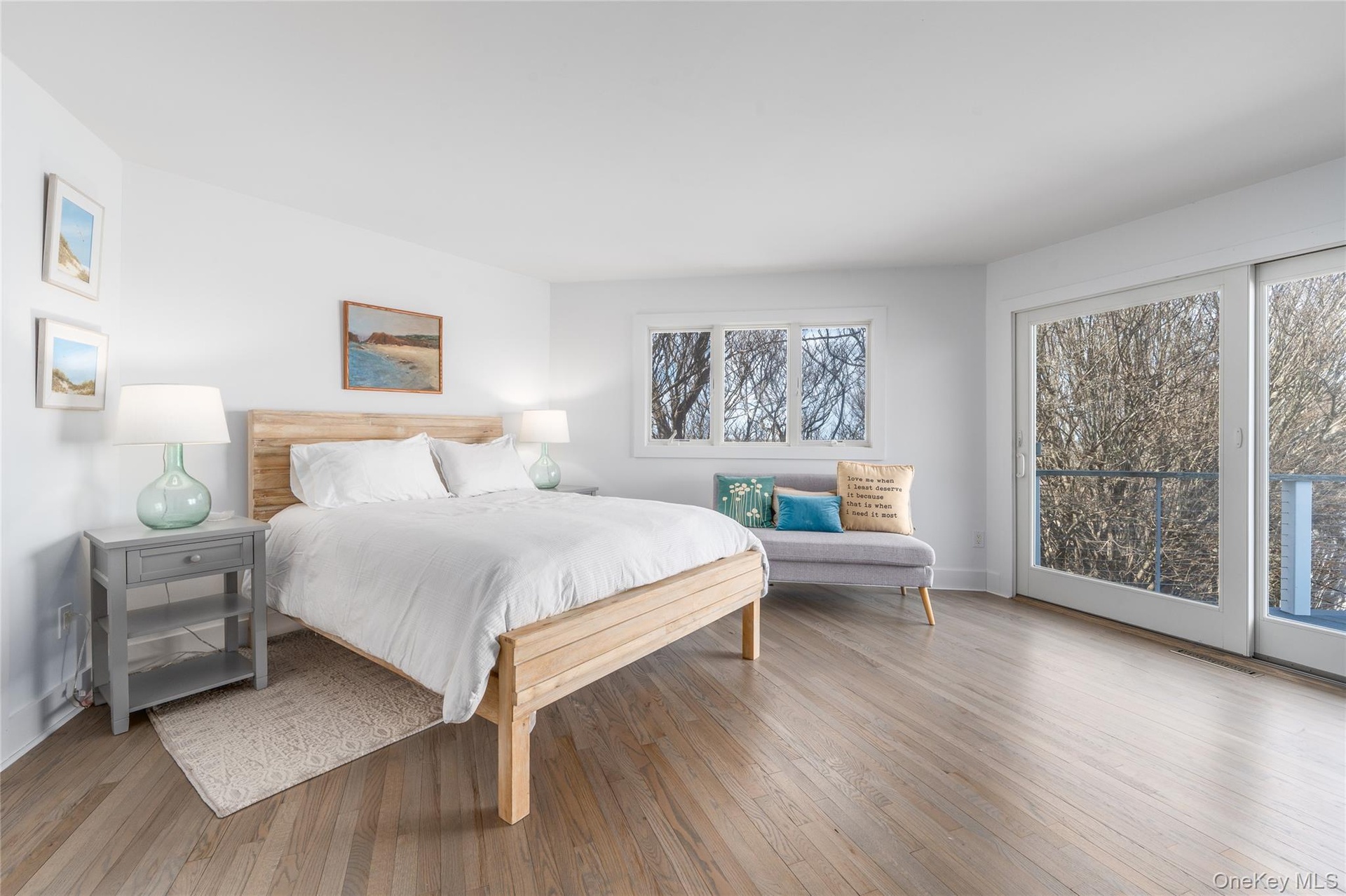 - Bedroom featuring baseboards, access to exterior, and wood finished floors