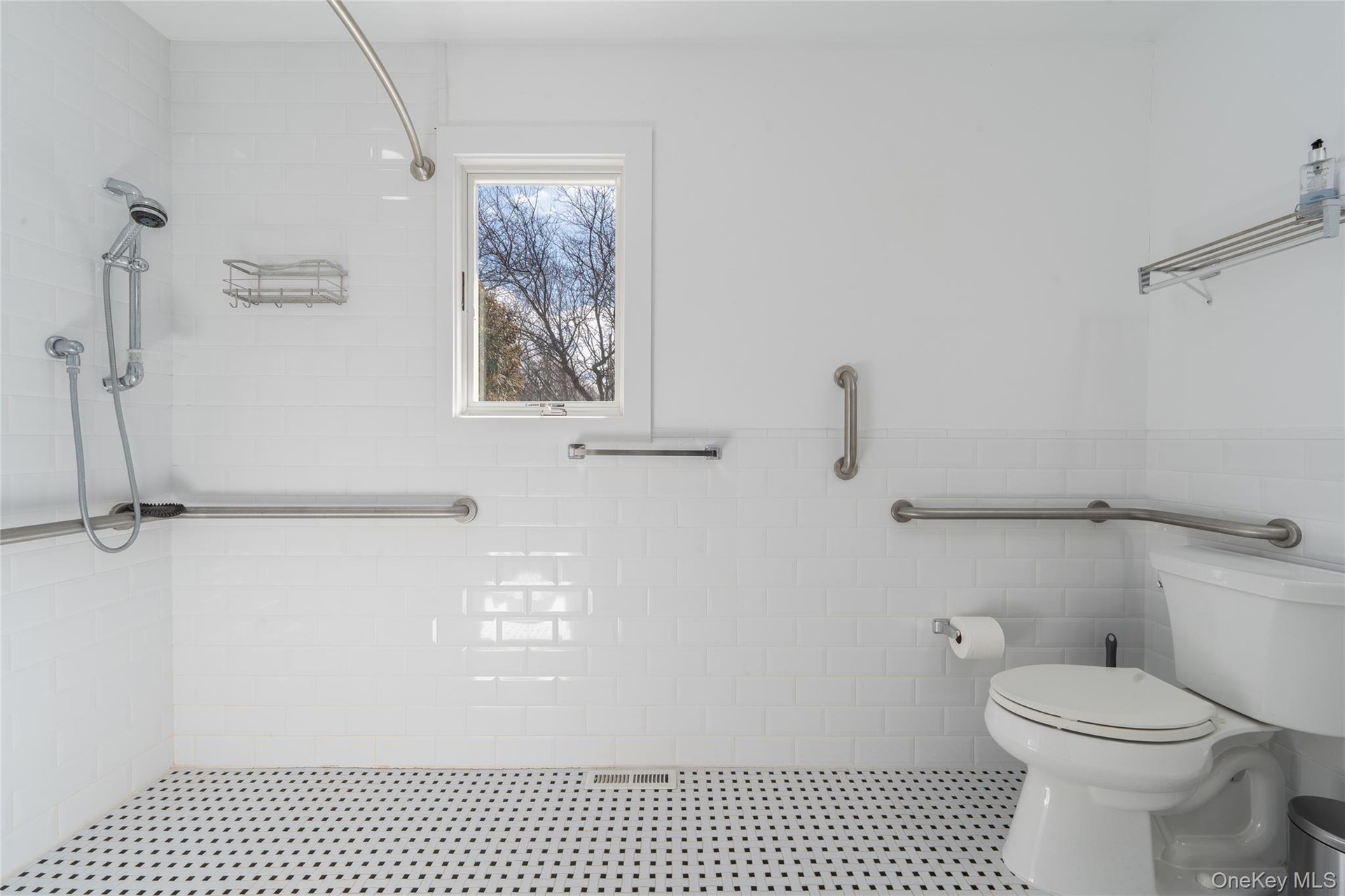 - Bathroom with tile walls, a wainscoted wall, toilet, and tiled shower
