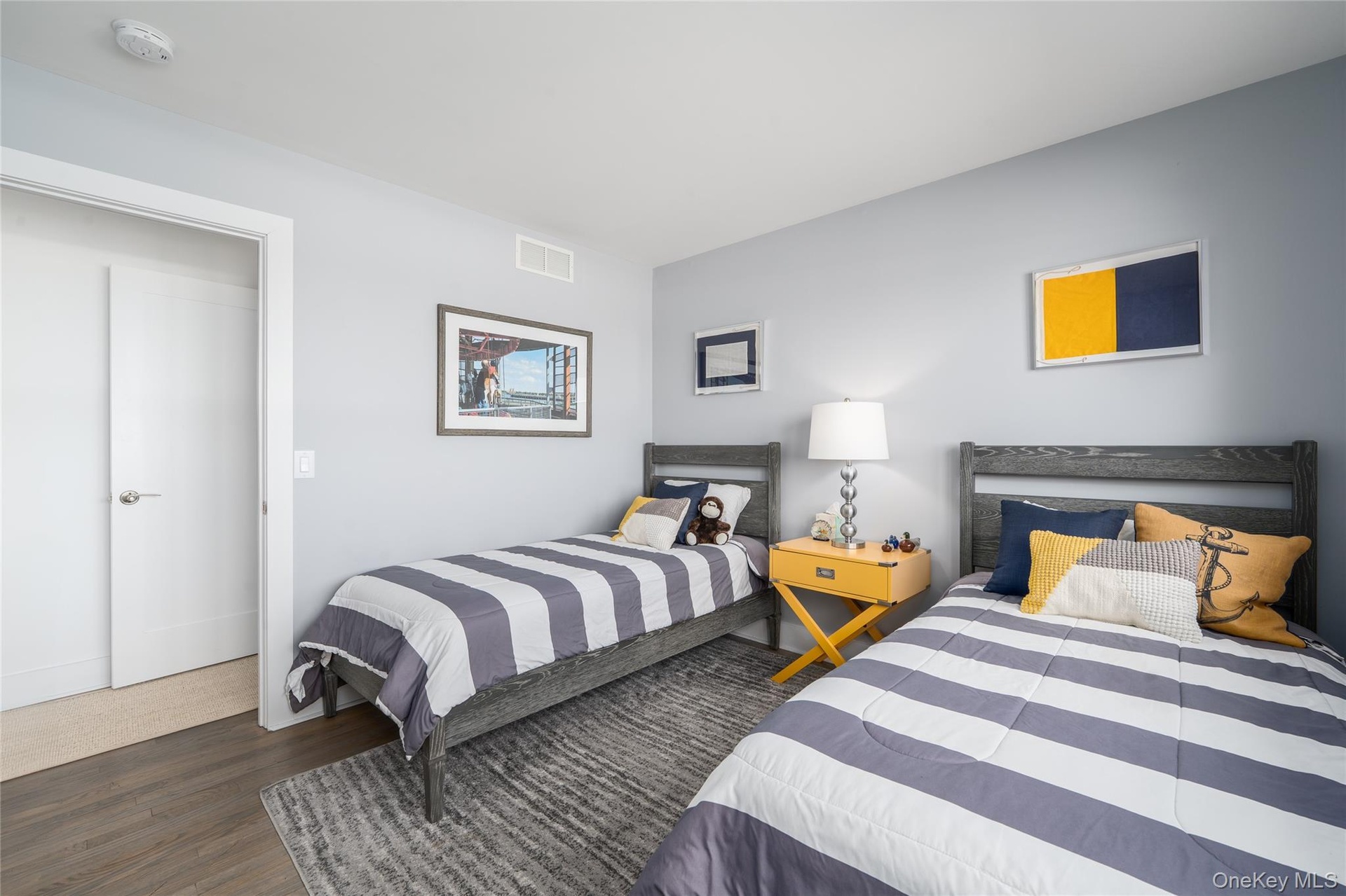 - Bedroom with light wood finished floors, baseboards, visible vents, and a closet