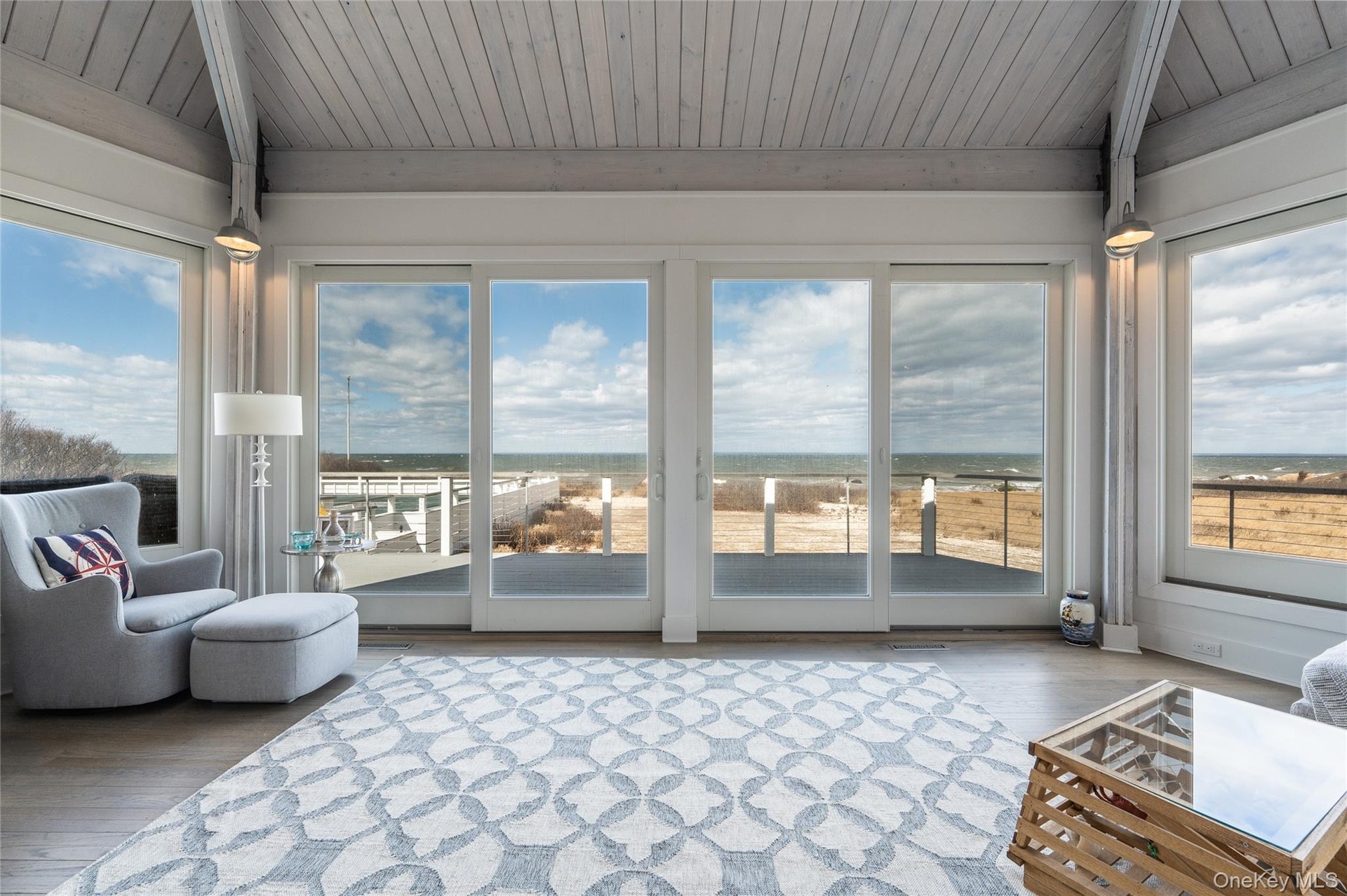 - Sunroom featuring vaulted ceiling, wooden ceiling, and hardwood / wood-style flooring