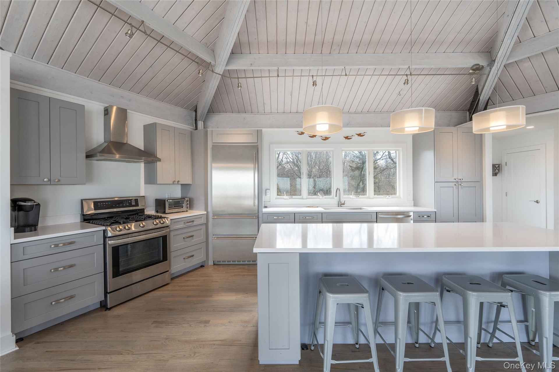 - Kitchen featuring a sink, vaulted ceiling with beams, gray cabinetry, light wood-style flooring, and stainless steel appliances
