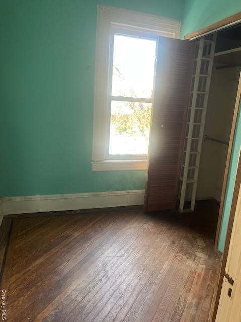 - Unfurnished bedroom with wood-type flooring and a closet