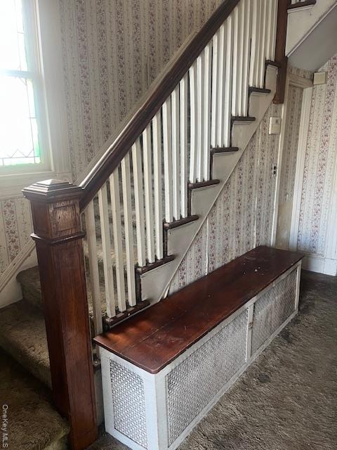 - Stairway with wallpapered walls, carpet, and radiator heating unit