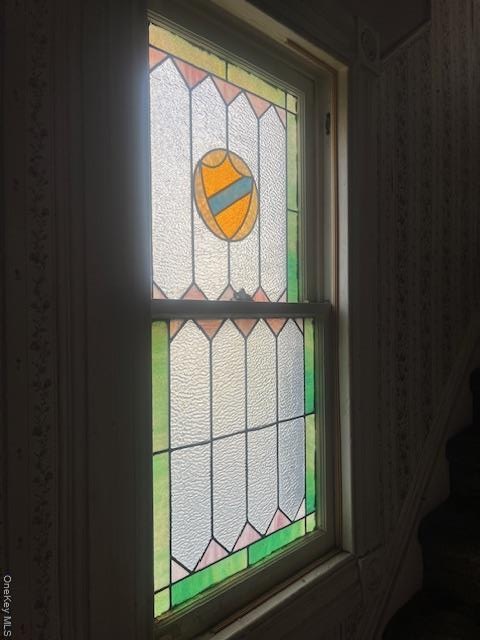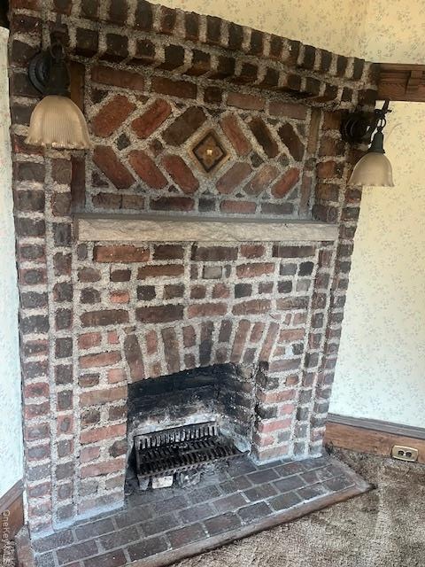 - Detailed view of wallpapered walls and a brick fireplace
