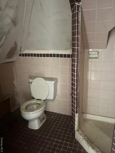 - Bathroom featuring dark tile patterned flooring, a shower stall, and tile walls