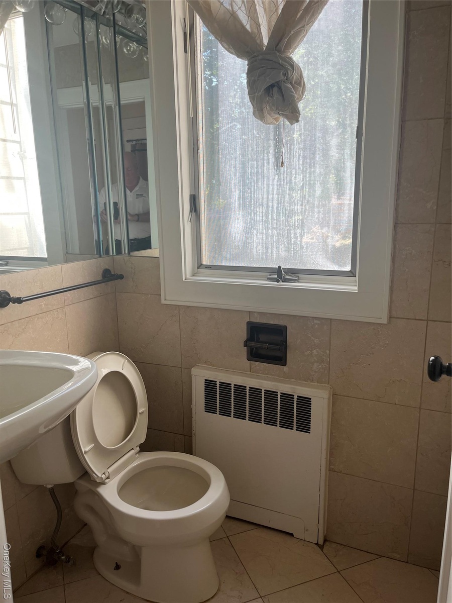 - Bathroom featuring tile walls, radiator, and tile patterned floors