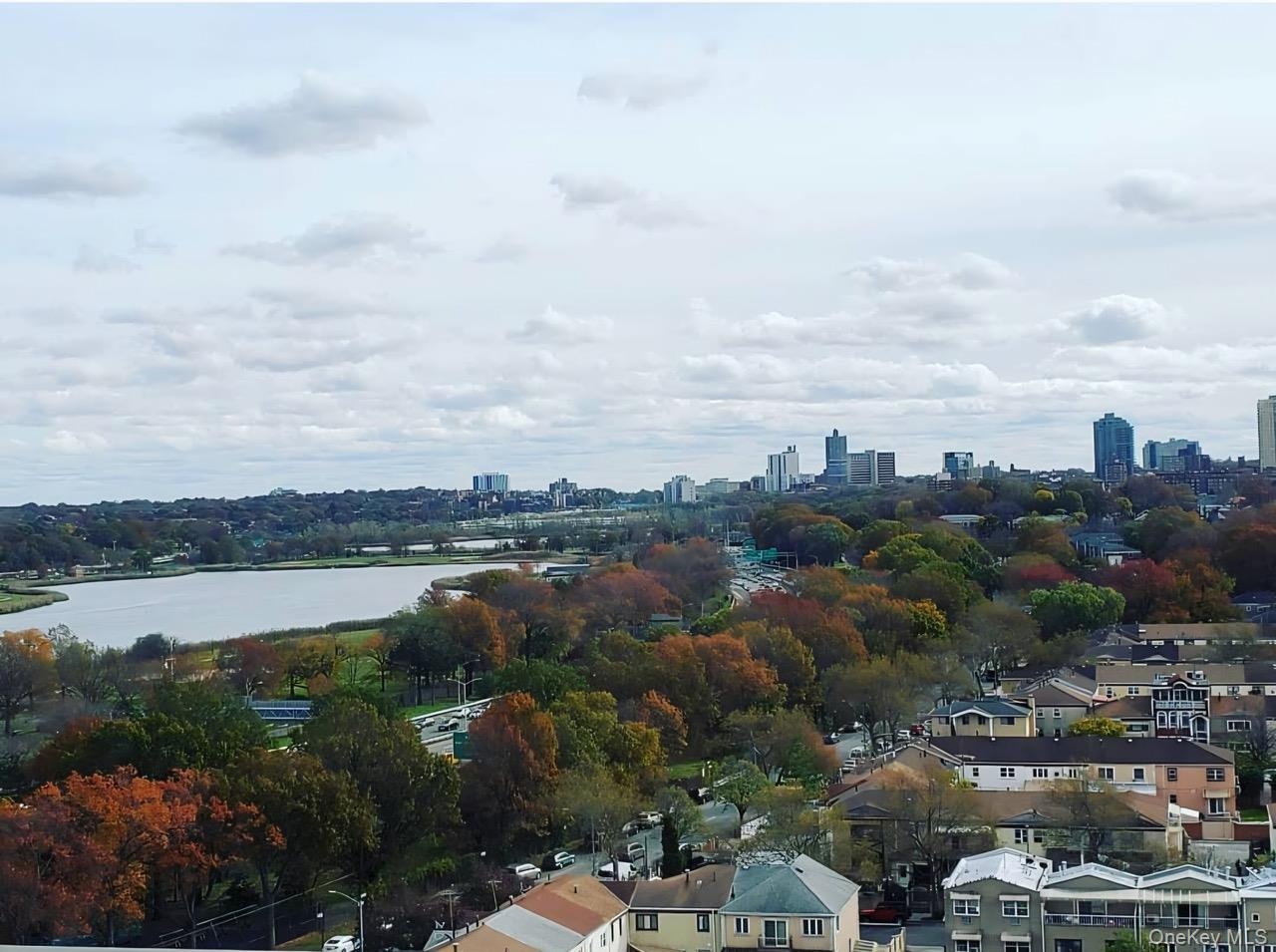 - Bird's eye view of skyline and a nearby body of water