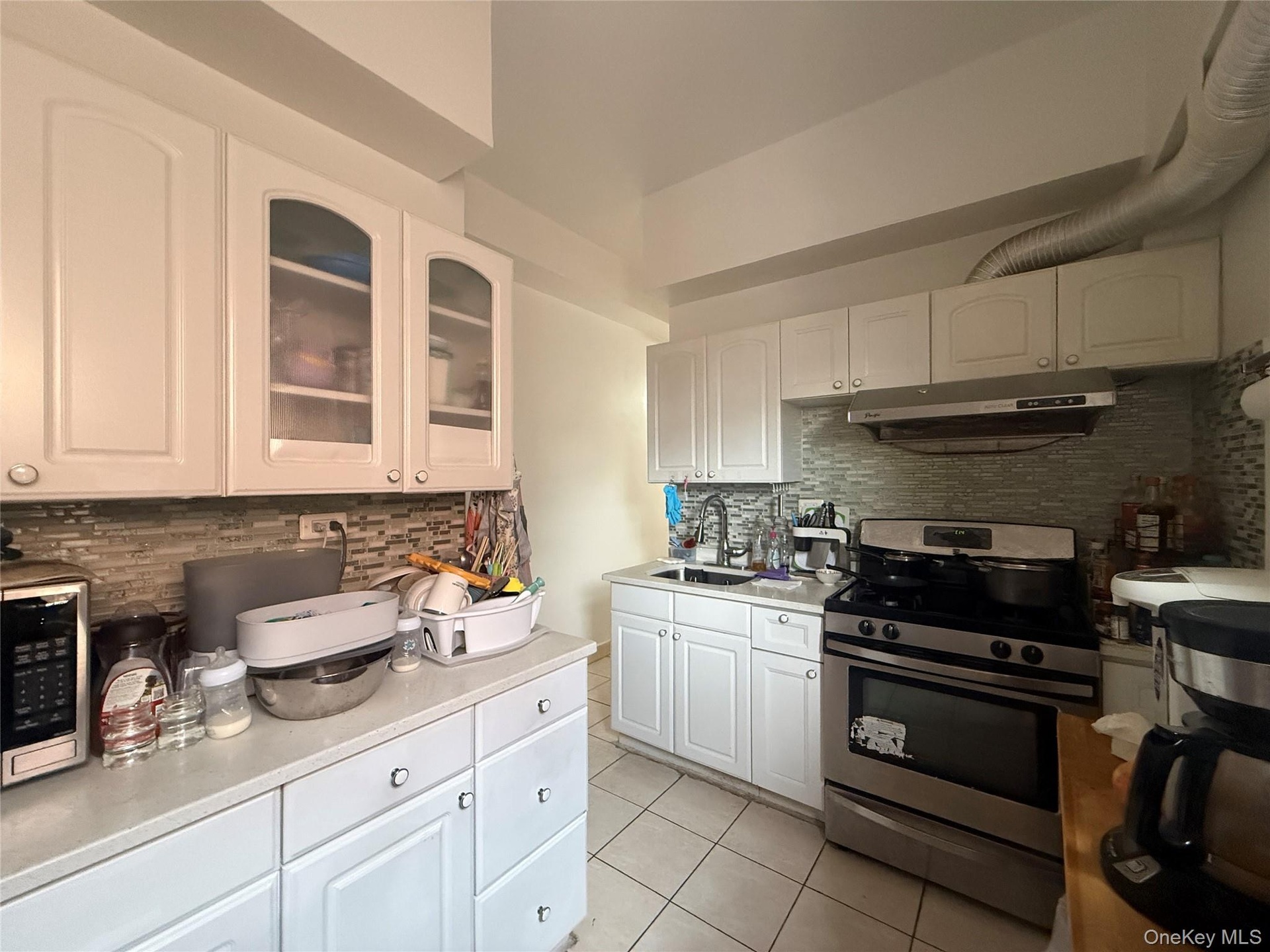 - Kitchen with stainless steel range with electric cooktop, light tile patterned flooring, white cabinetry, under cabinet range hood, and tasteful backs