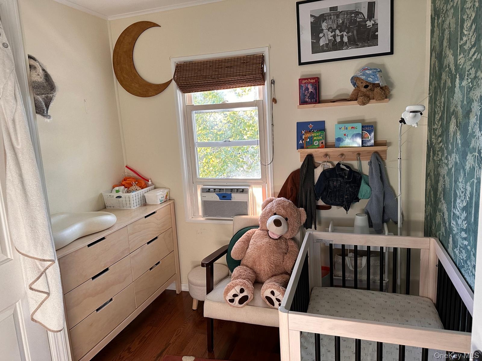 - Bedroom featuring dark wood-type flooring and cooling unit