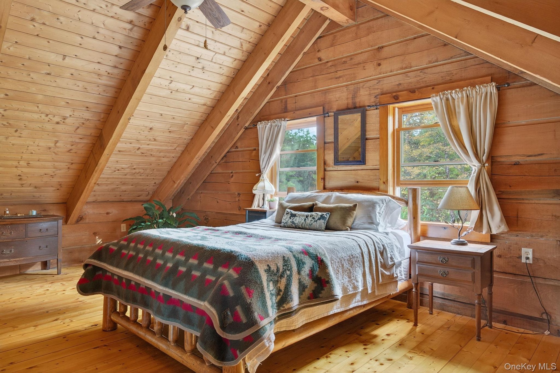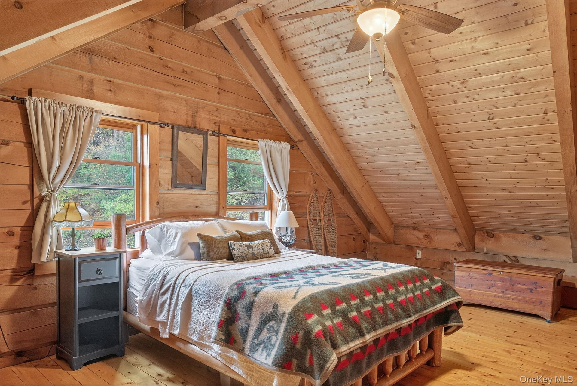 - Bedroom with wooden ceiling, wood-type flooring, wood walls, multiple windows, and a ceiling fan