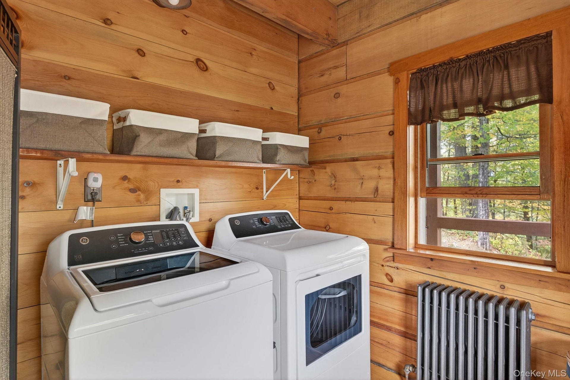 - Laundry area featuring radiator, wooden walls, and washing machine and dryer