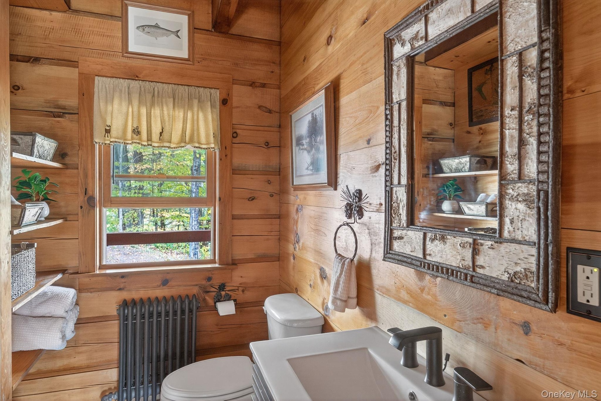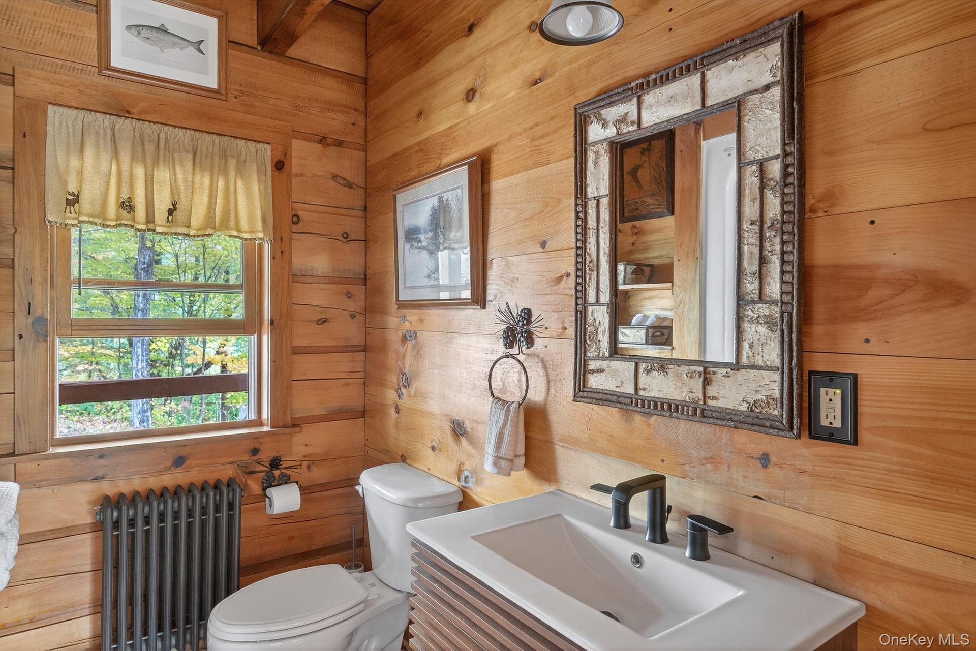 - Kitchen with wood walls, radiator, light countertops, plenty of natural light, and dark wood-style floors