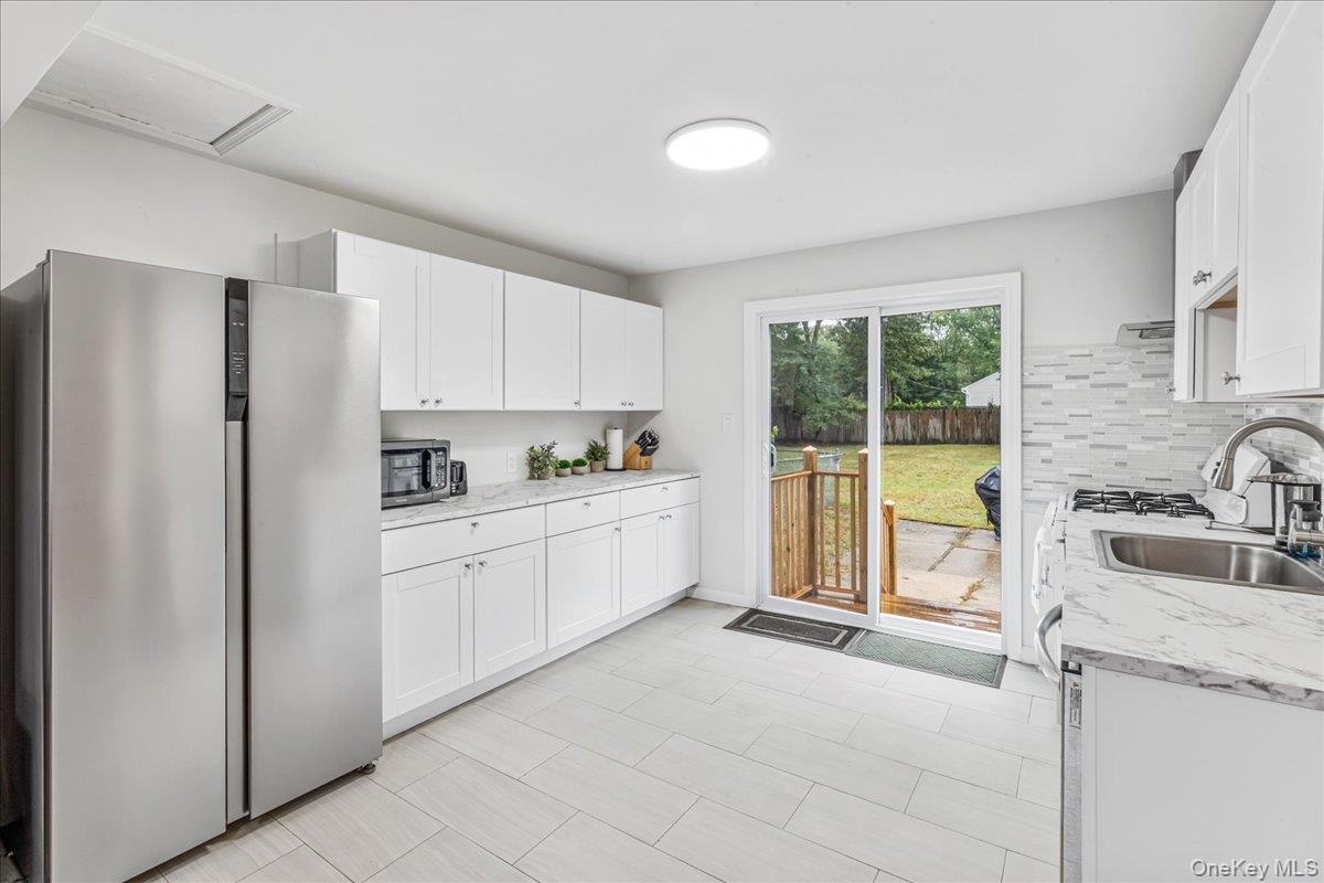 - Kitchen with stainless steel appliances, white cabinets, backsplash, and light stone counters