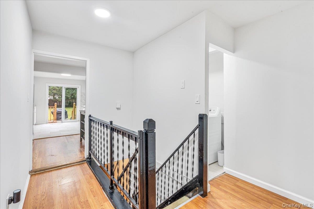 - Staircase featuring wood finished floors and washer / clothes dryer