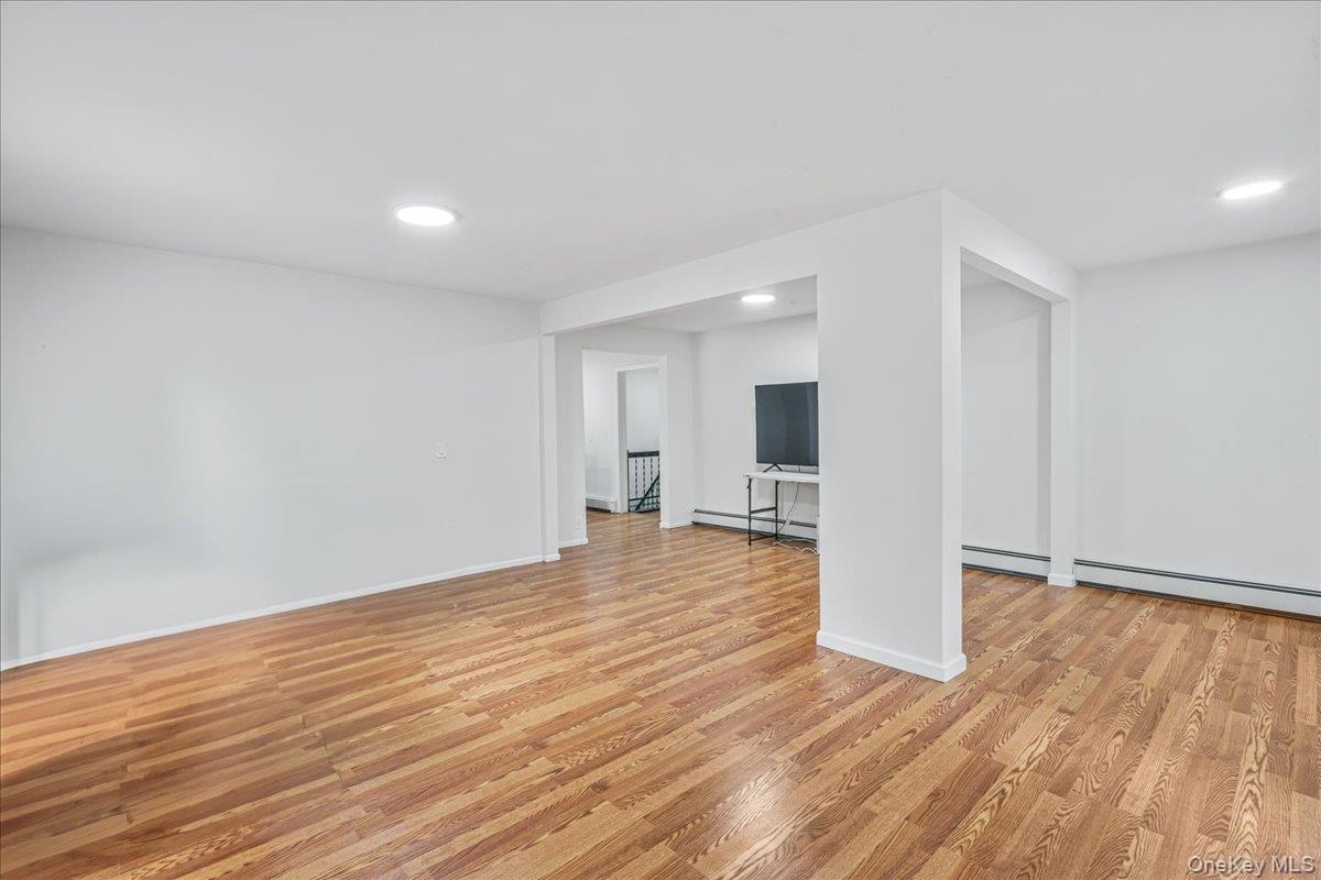 - Unfurnished living room with light wood-style flooring, recessed lighting, and a baseboard radiator