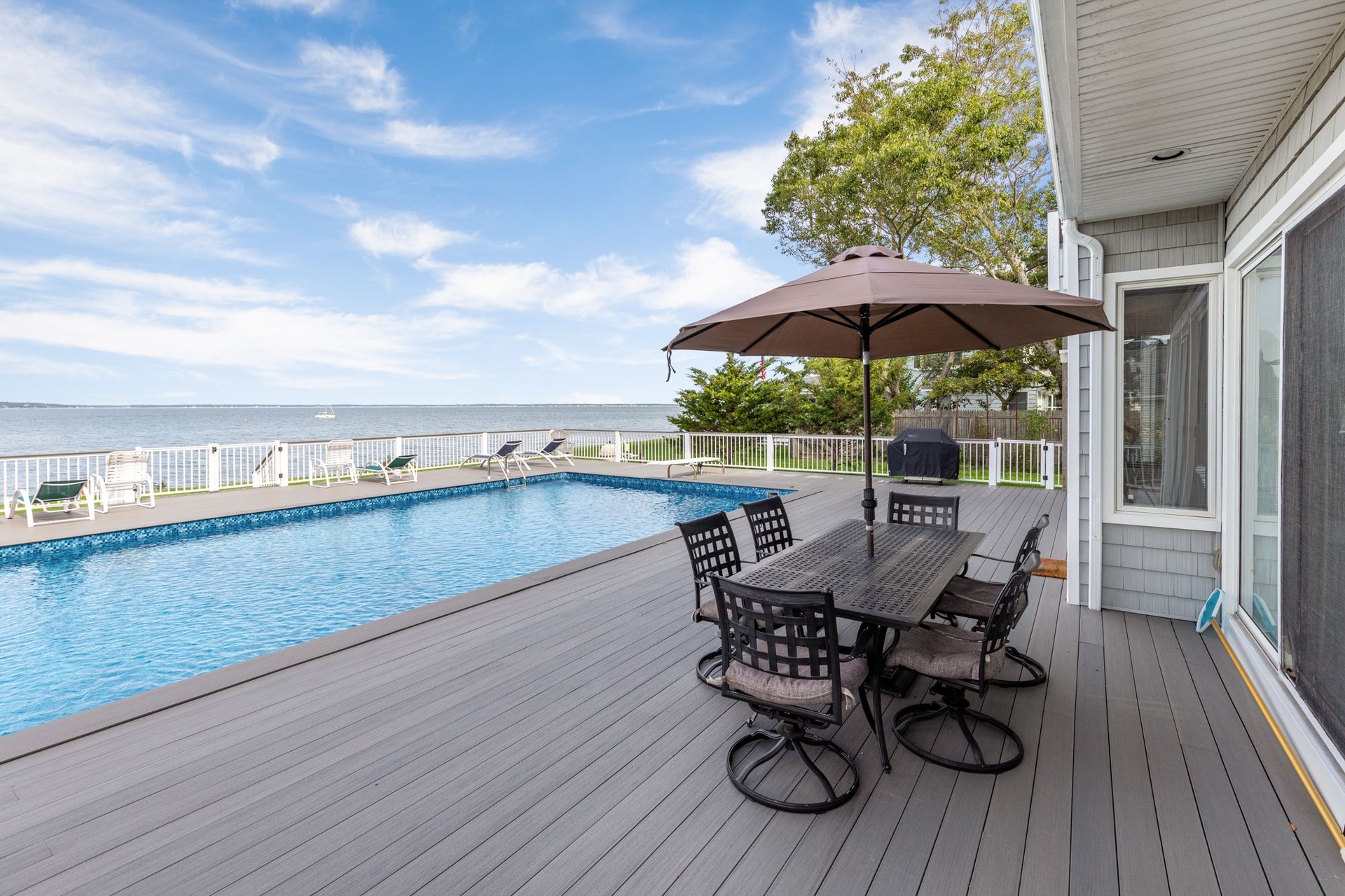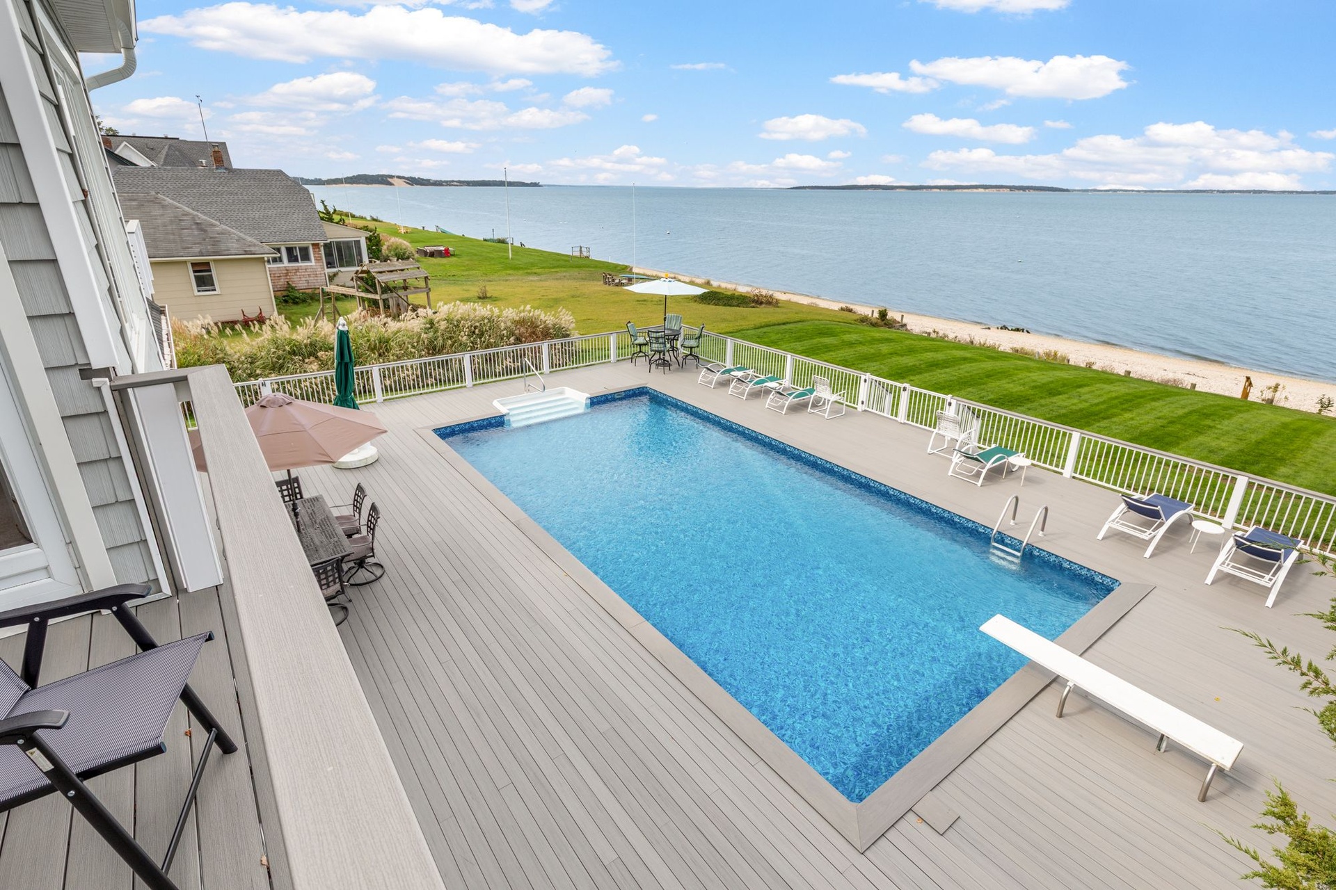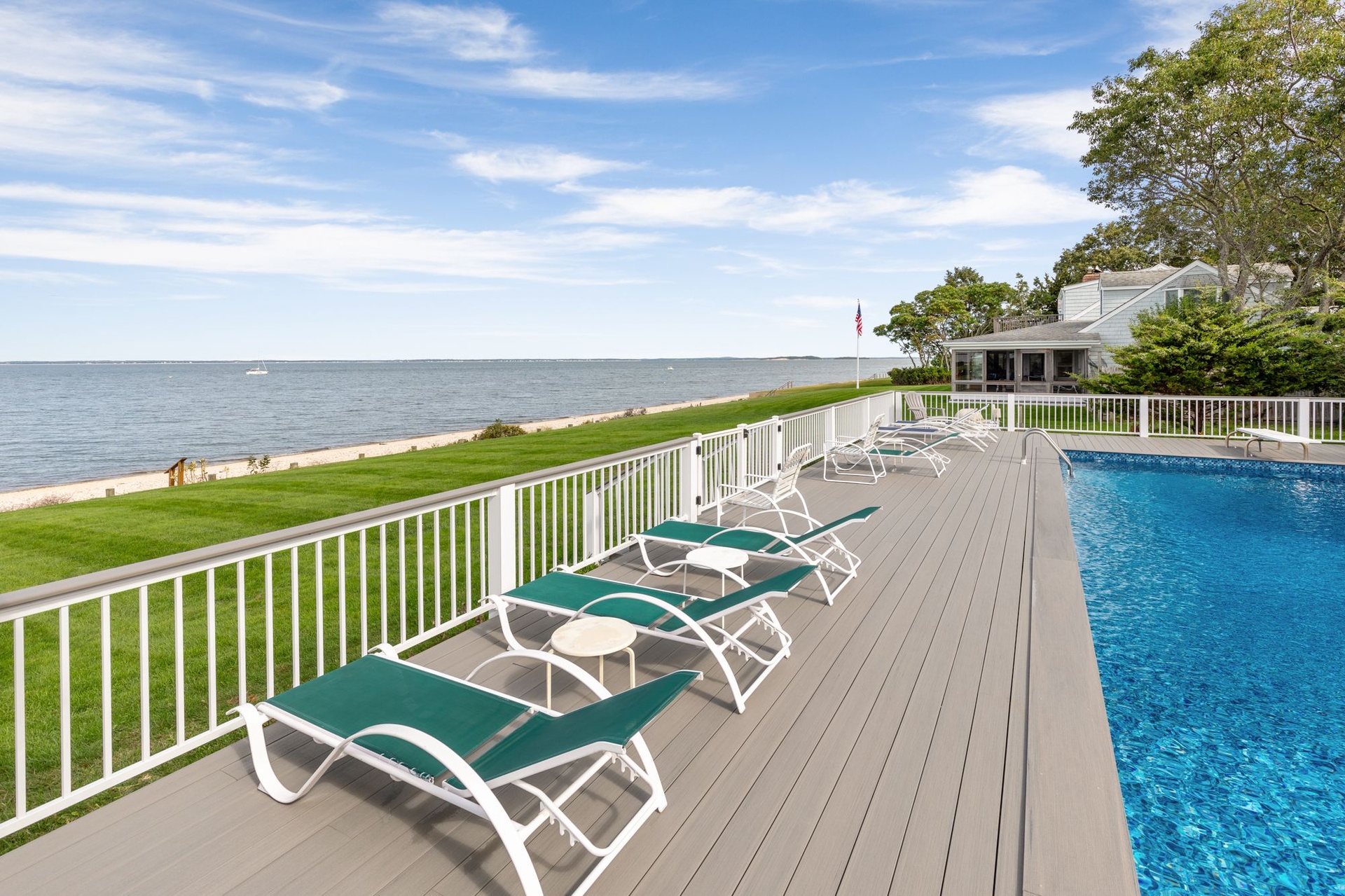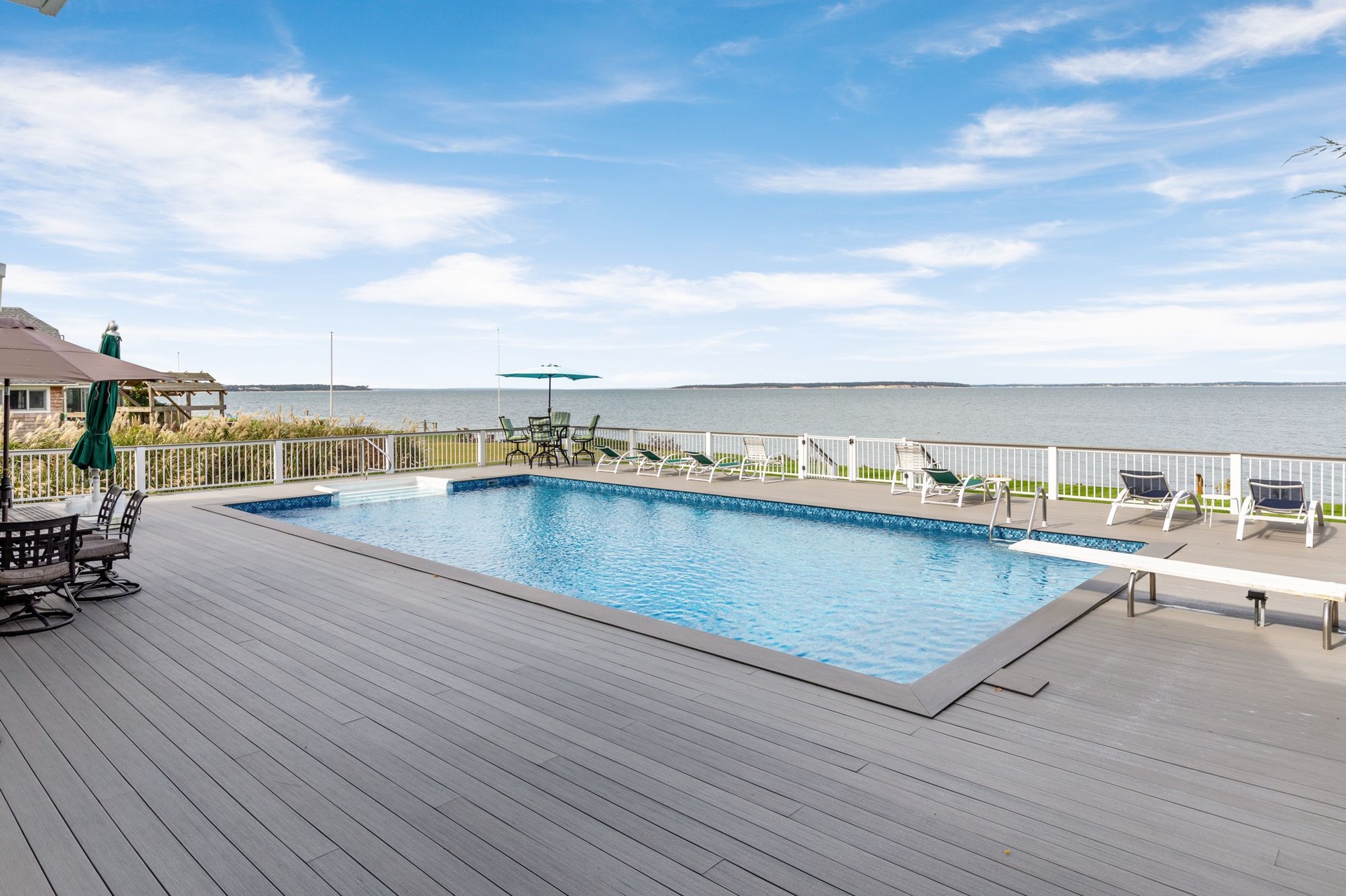 Step outside to a spacious waterside deck furnished with lounge chairs, umbrellas, and dining space—perfect for summer gatherings and sunset cocktails. Just beyond sits a 40’ x 20’ vinyl pool, with the Peconic Bay and your own private beachfront only steps away.