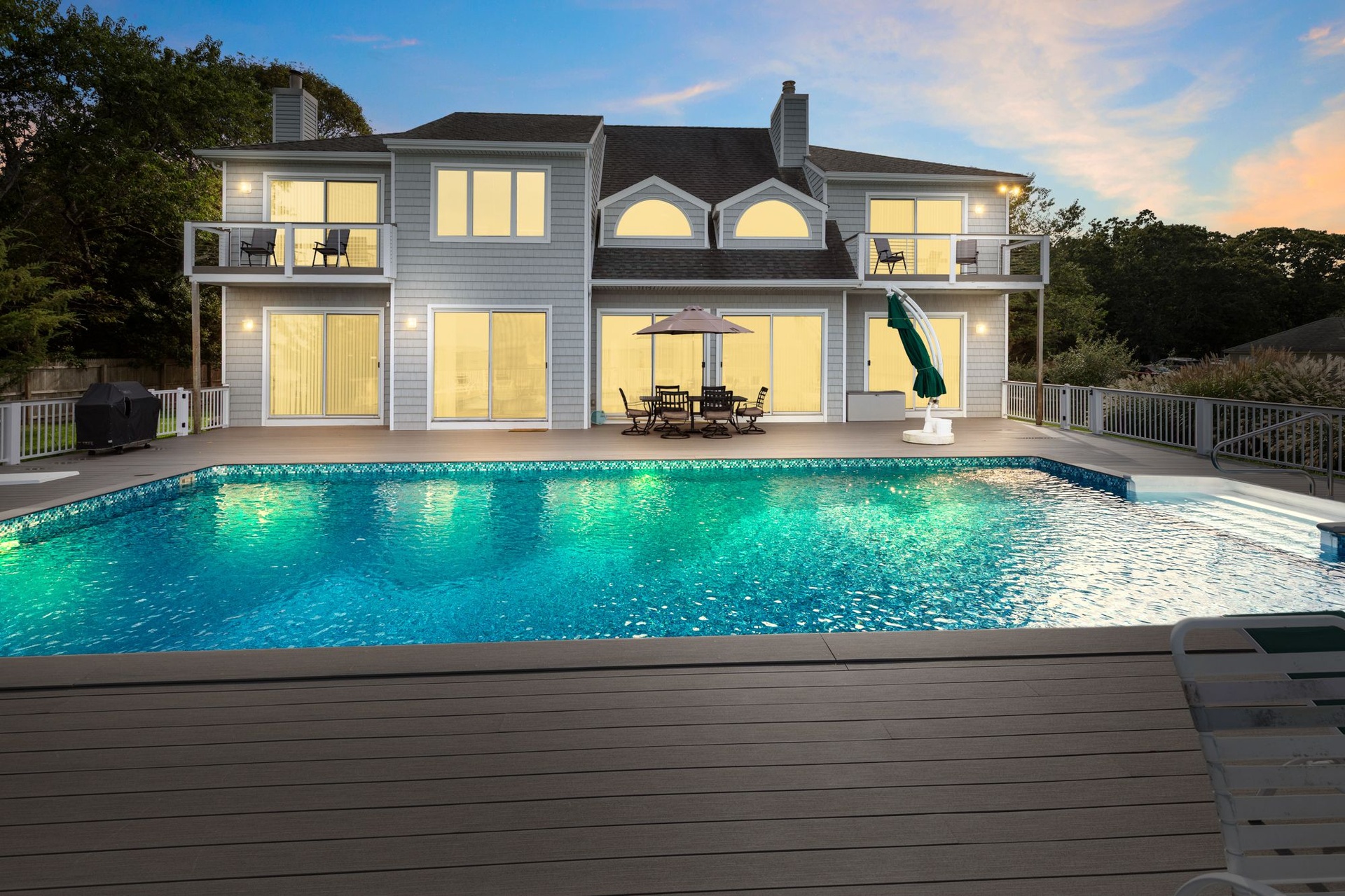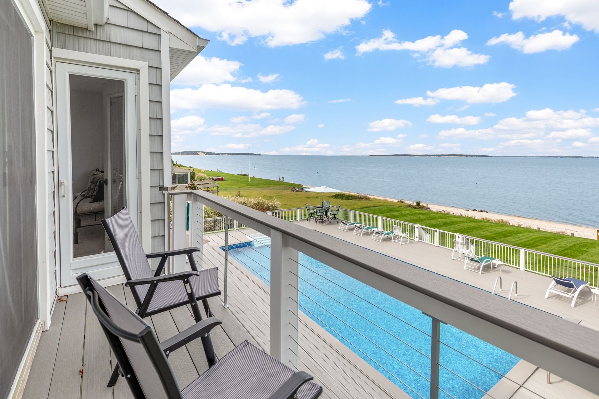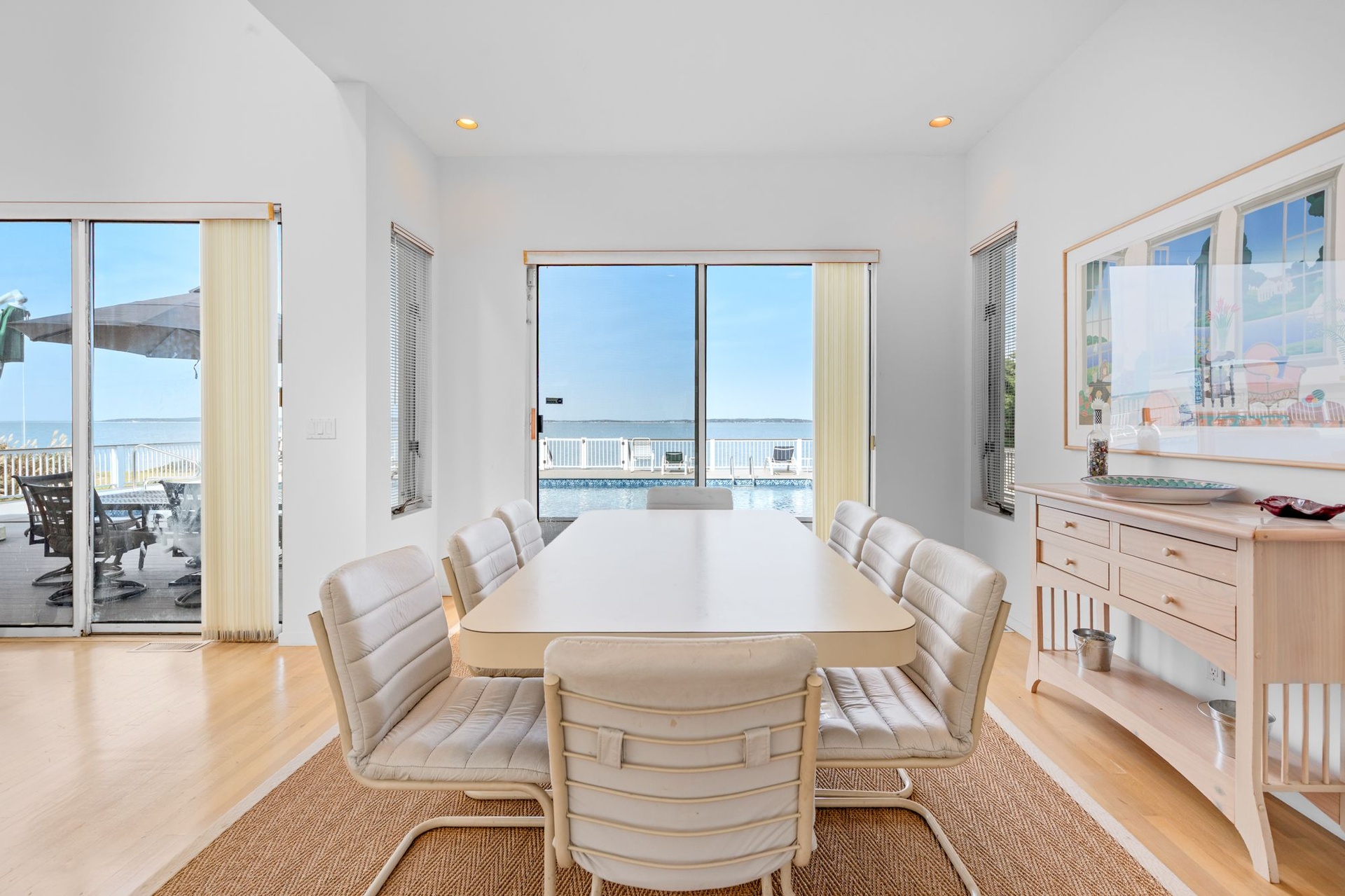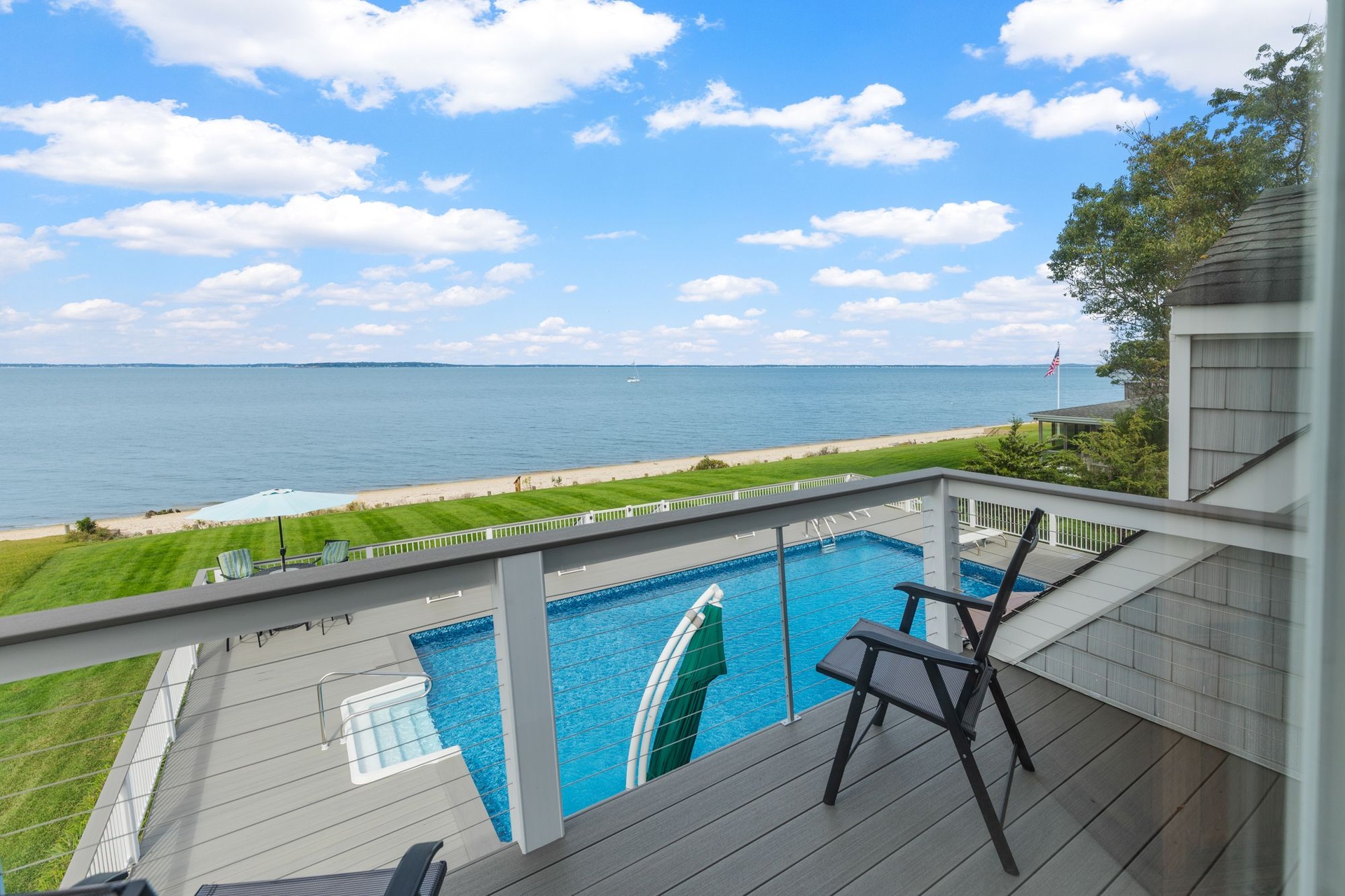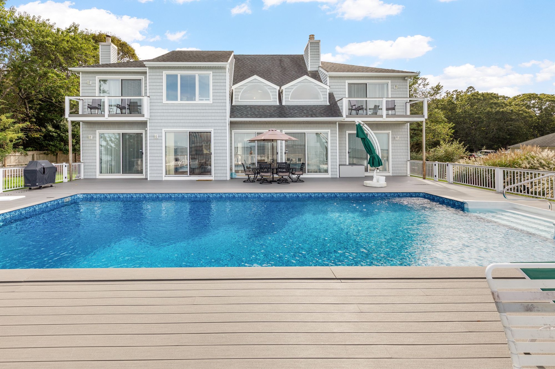 Step outside to a spacious waterside deck furnished with lounge chairs, umbrellas, and dining space—perfect for summer gatherings and sunset cocktails. Just beyond sits a 40’ x 20’ vinyl pool, with the Peconic Bay and your own private beachfront only steps away.