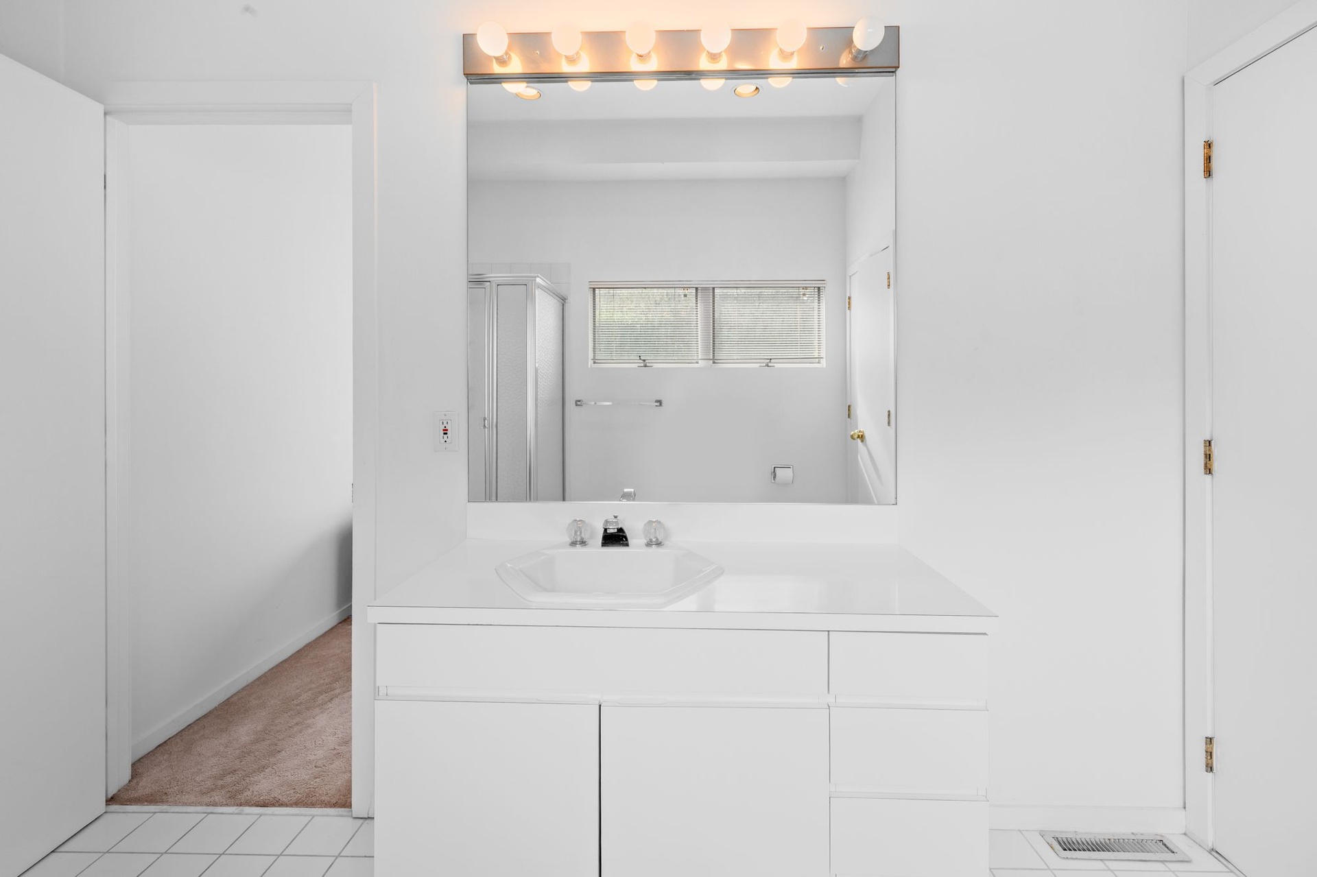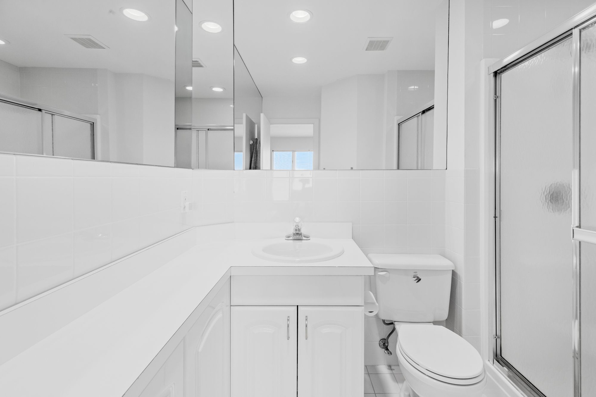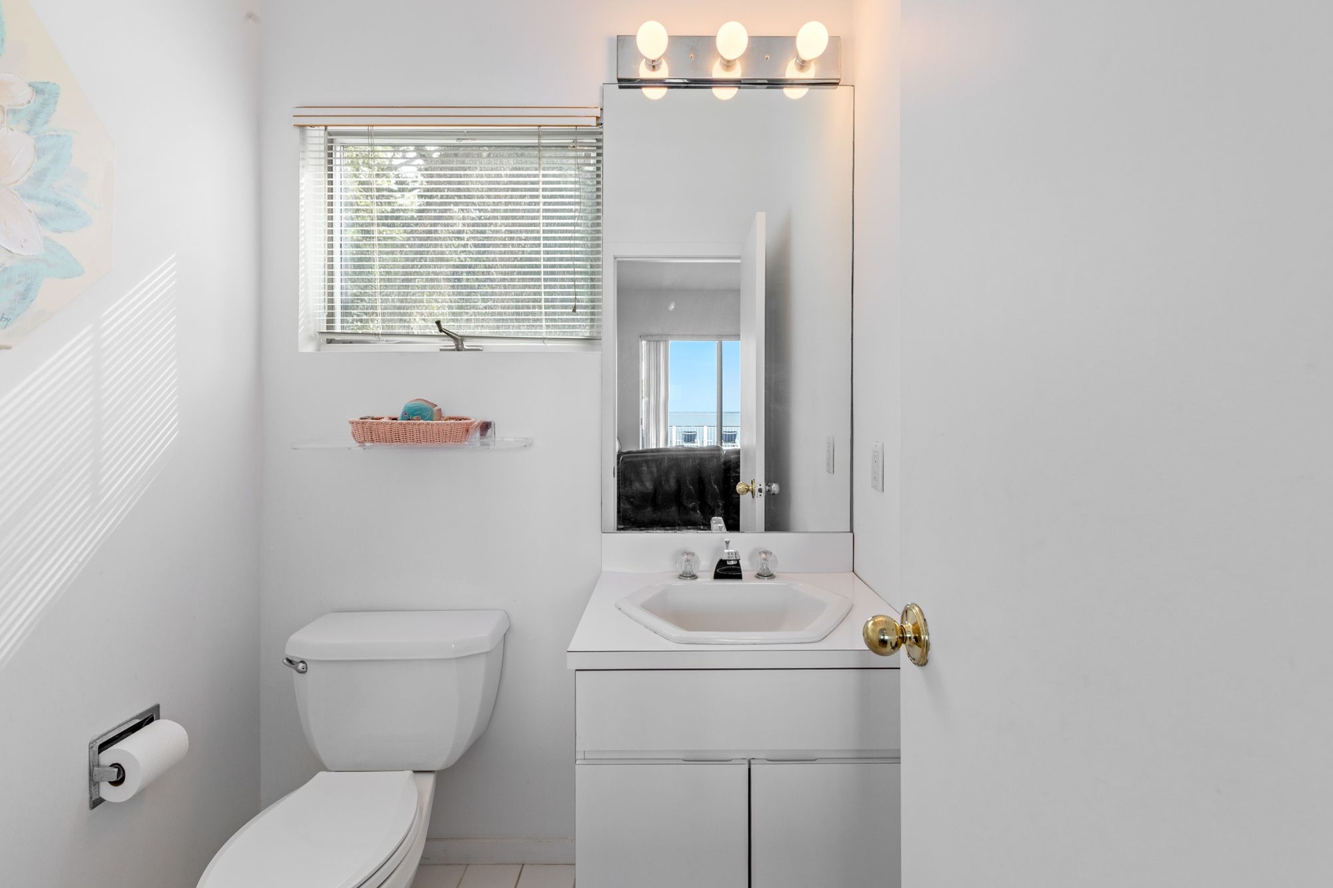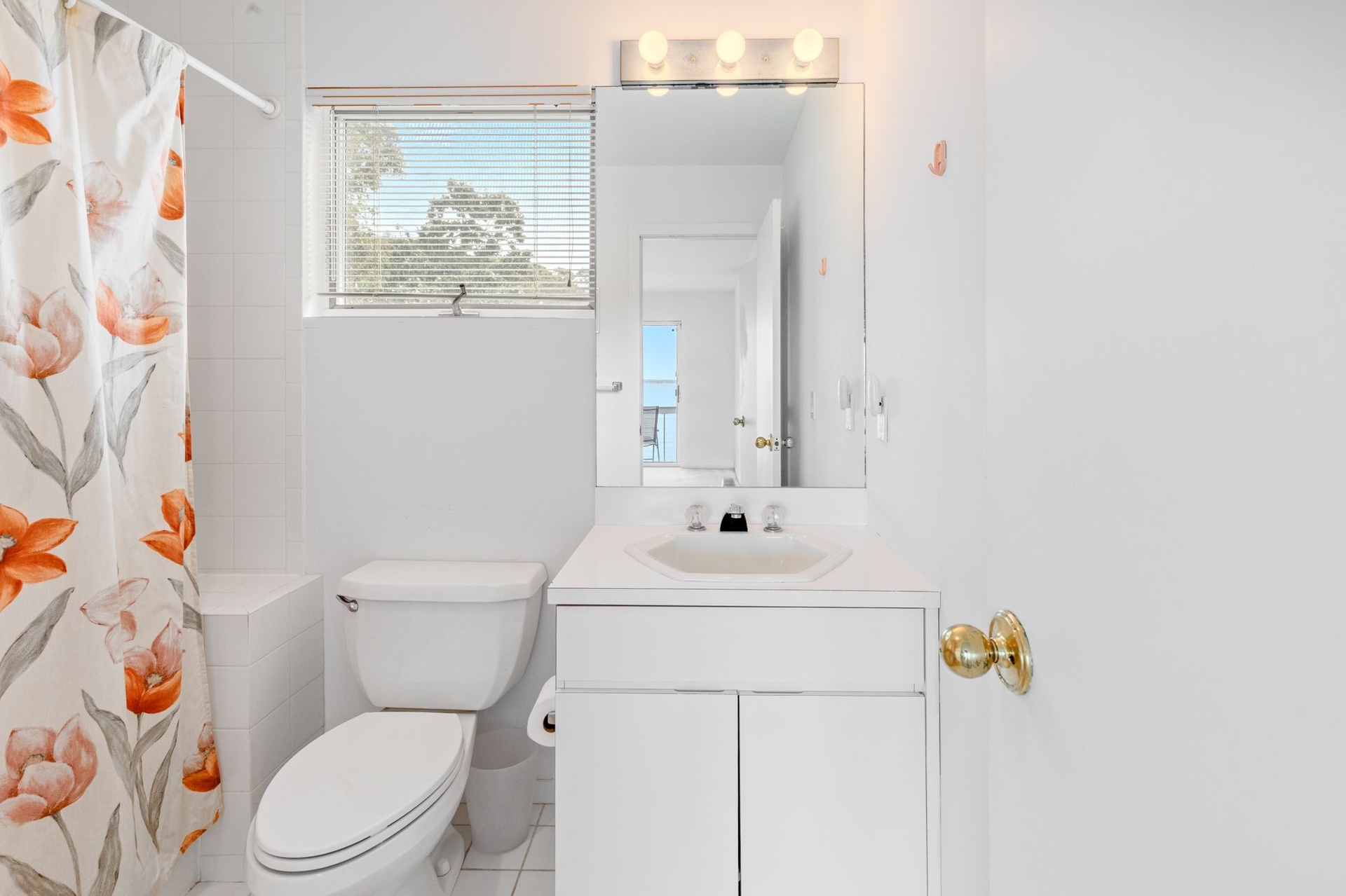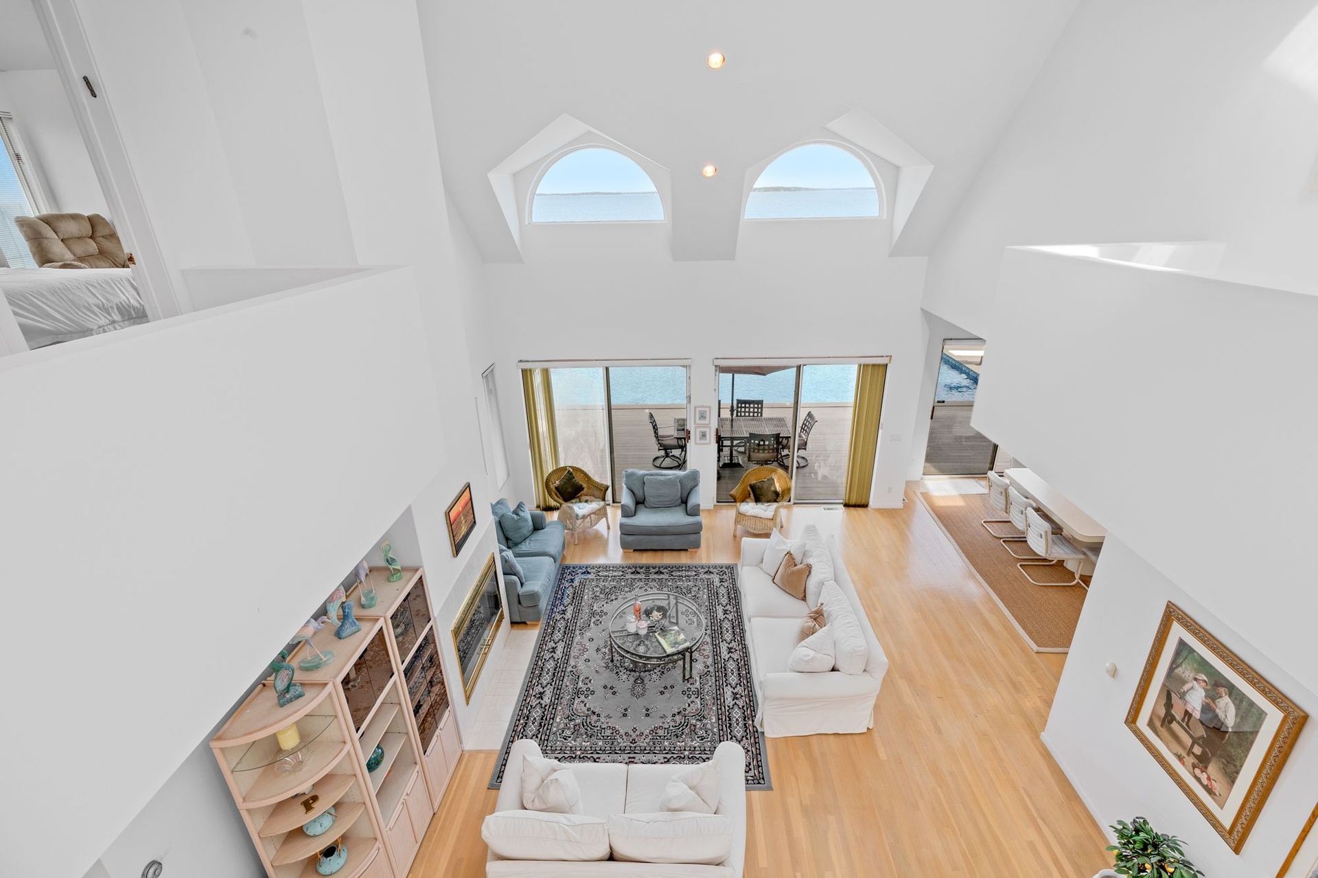 Upstairs, a second suite boasts vaulted ceilings, his-and-hers sinks, a walk-in closet, and a jacuzzi bathroom. Two additional sunny guest bedrooms are also located on this level, offering views of the water and pool area. A balcony stretches across the north and south sides of the home, enhancing the indoor-outdoor connection.