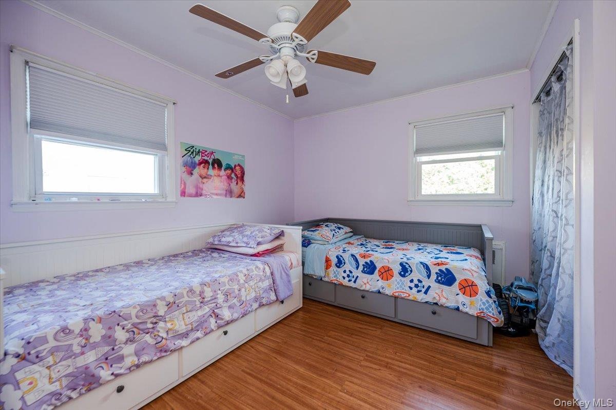 - Bedroom featuring wood finished floors, crown molding, ceiling fan, and radiator heating unit