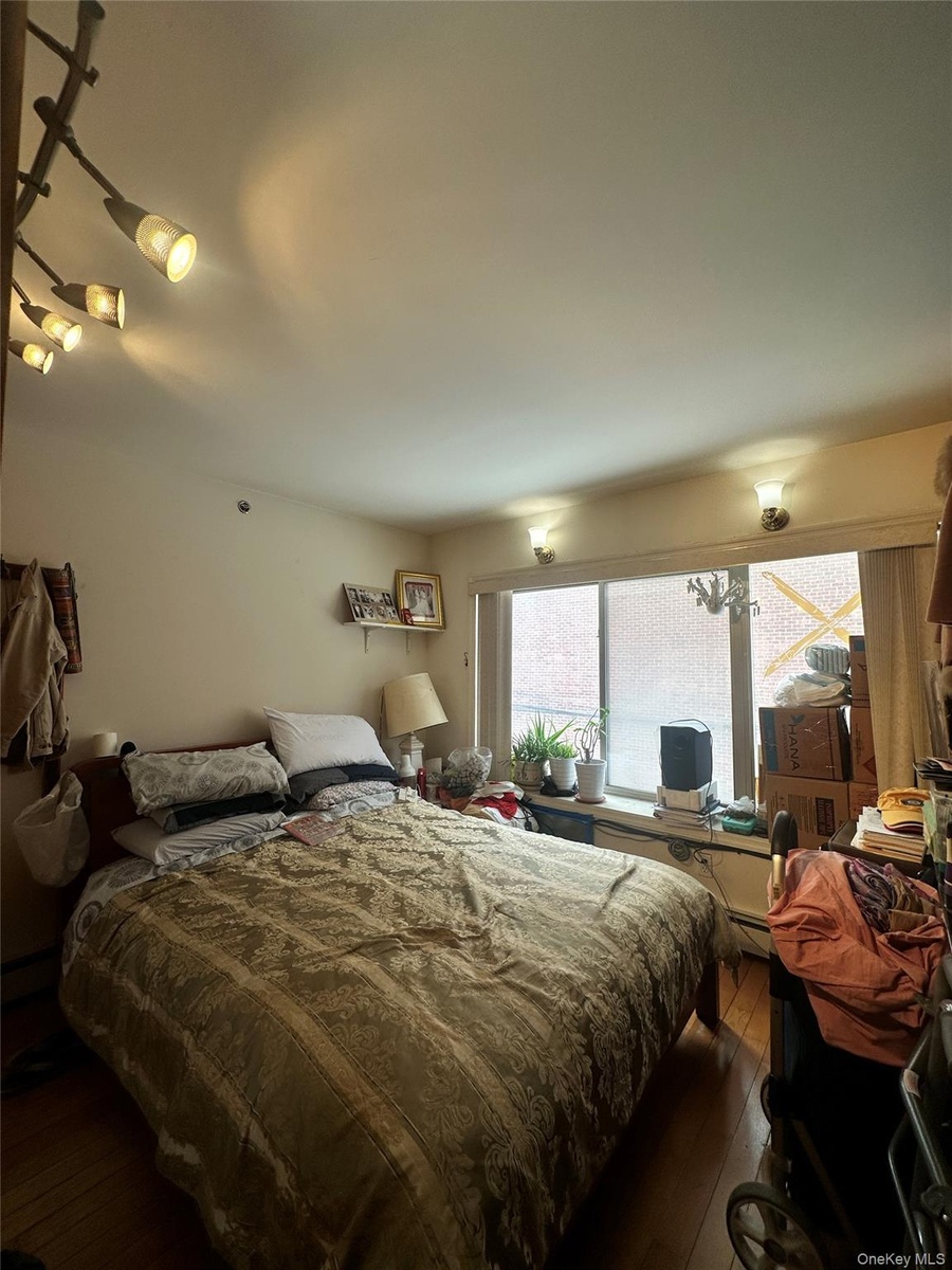 - Bedroom featuring a baseboard radiator and dark wood-type flooring