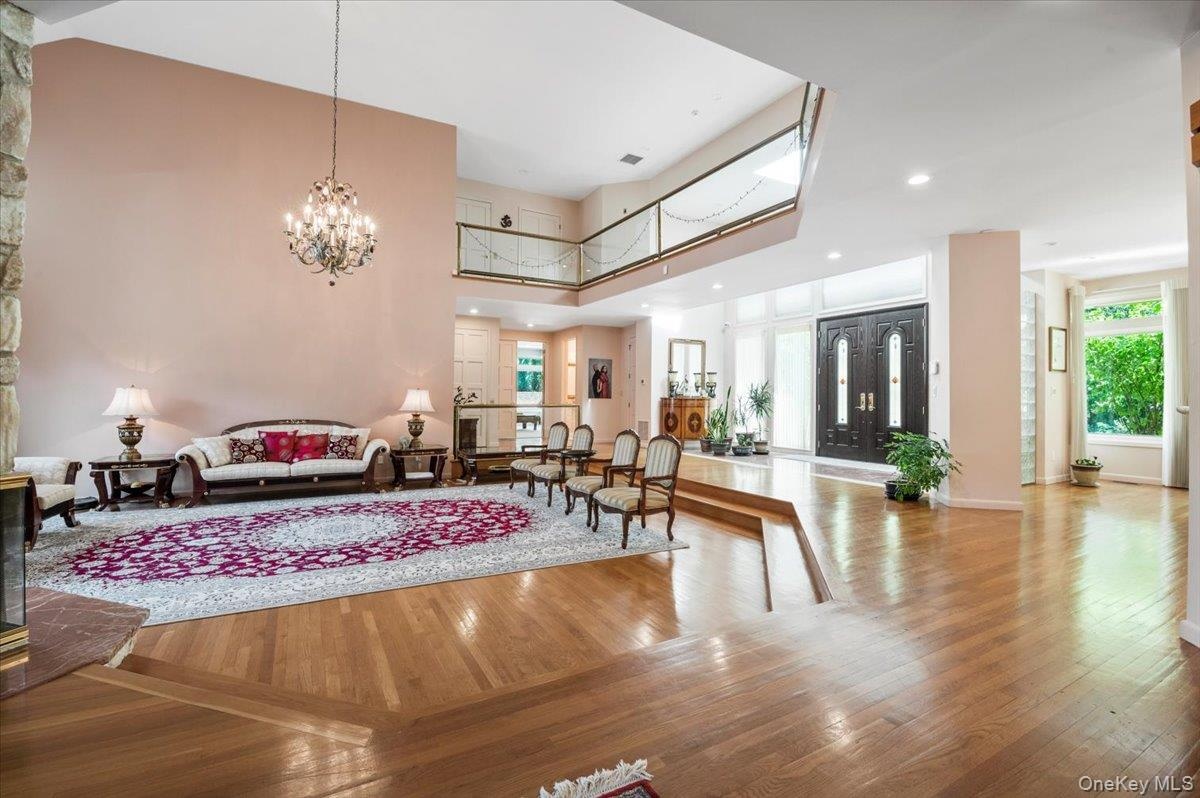 - Living room with recessed lighting, wood-type flooring, plenty of natural light, high vaulted ceiling, and a chandelier