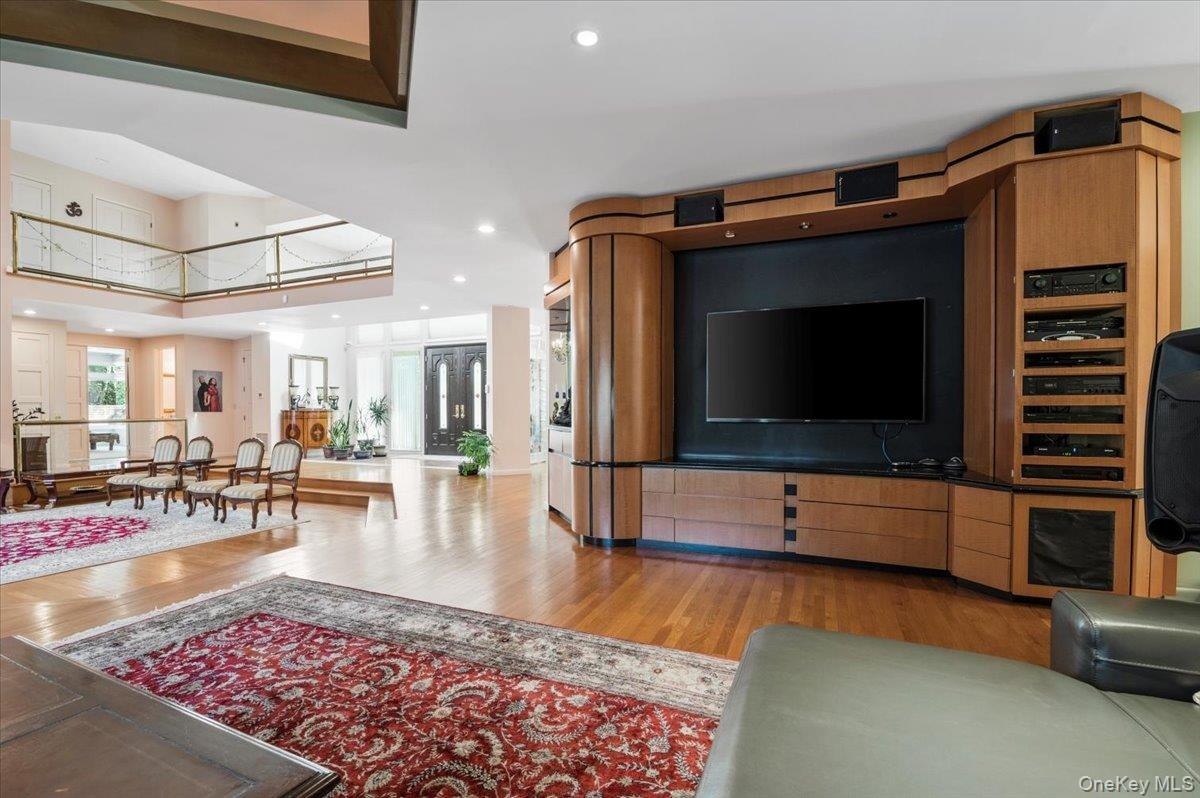 - Living room with light wood-style flooring and recessed lighting
