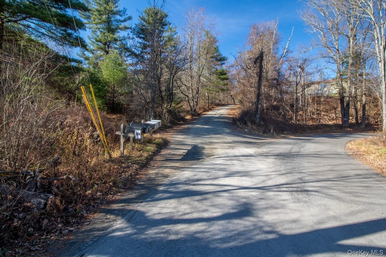 - View of dirt / gravel road with a wooded view
