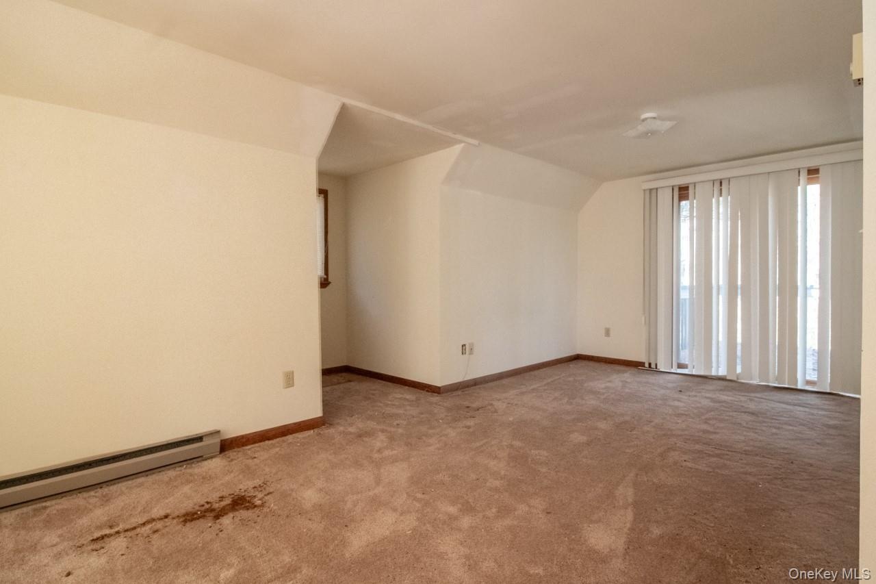 - Unfurnished room with light colored carpet and a baseboard radiator