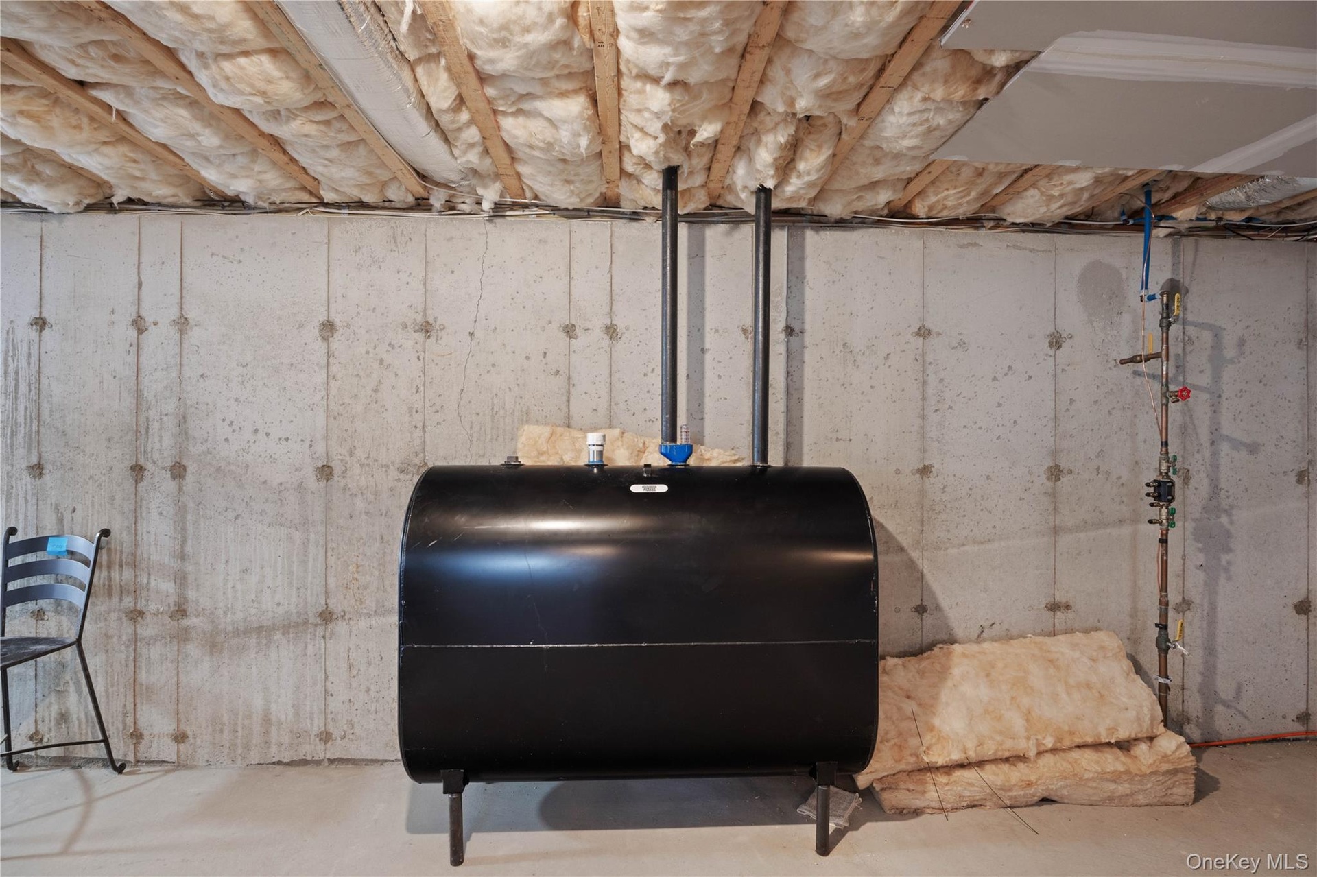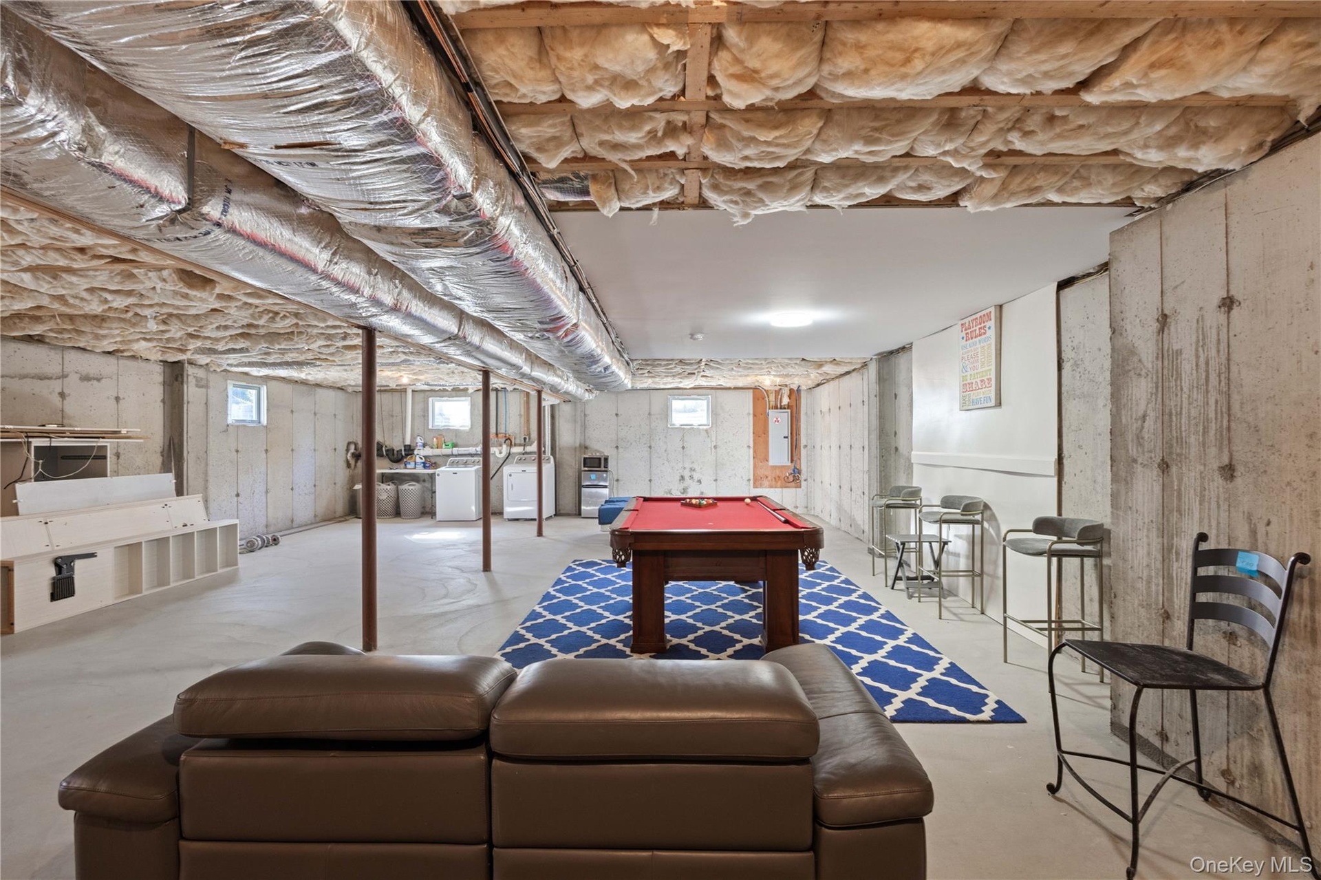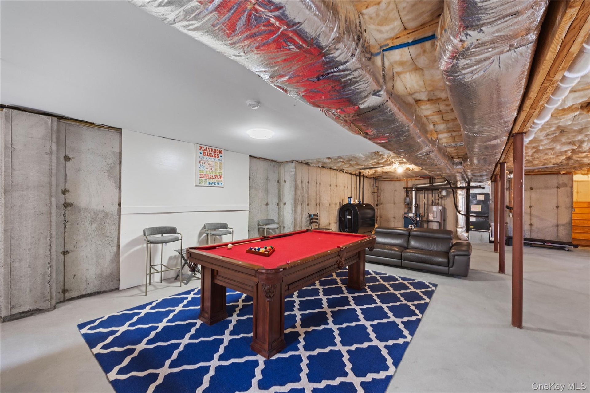 - Rec room featuring billiards table, concrete floors, heating fuel, and water heater