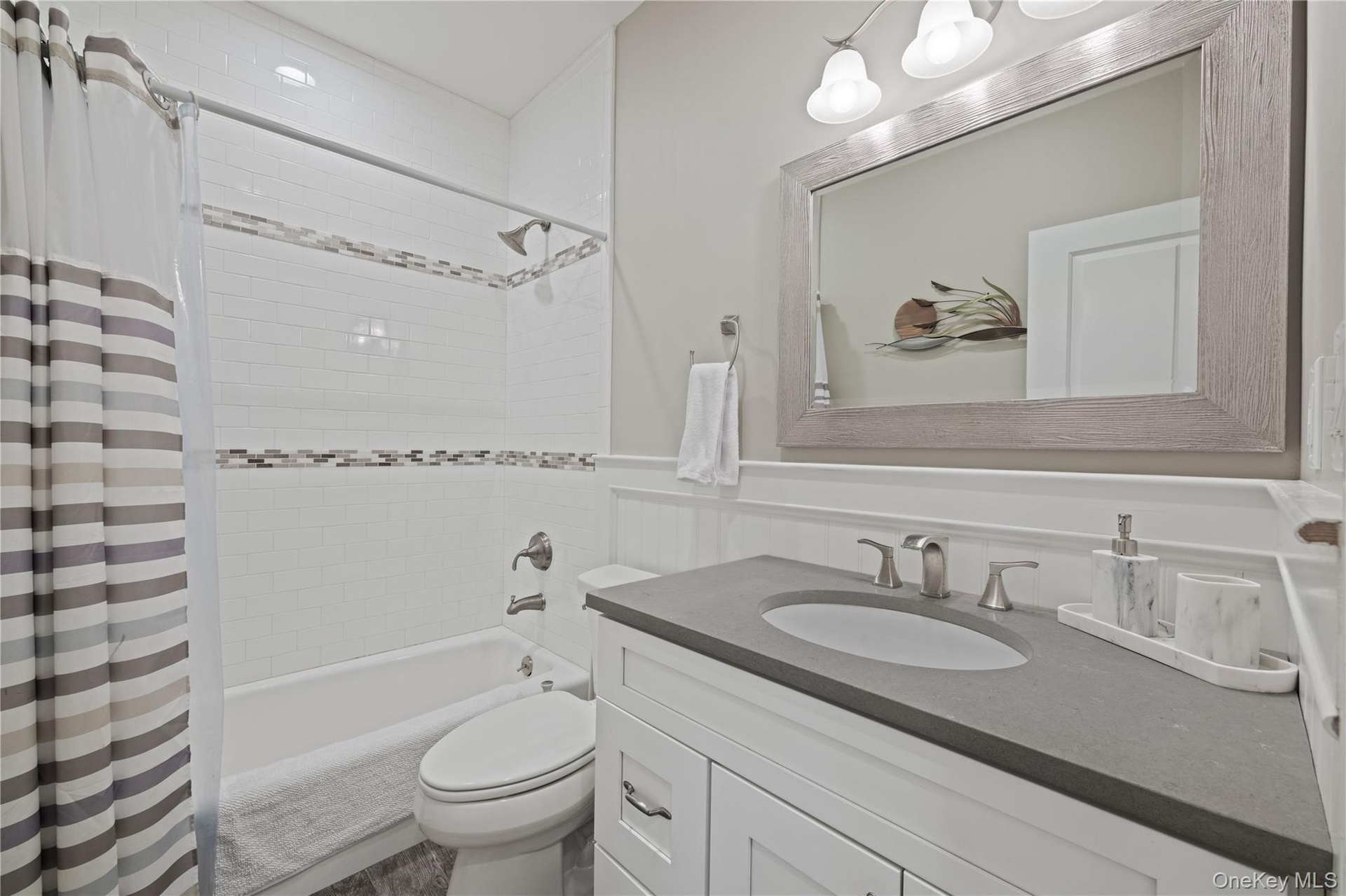 - Bathroom with shower / tub combo, vanity, and wainscoting