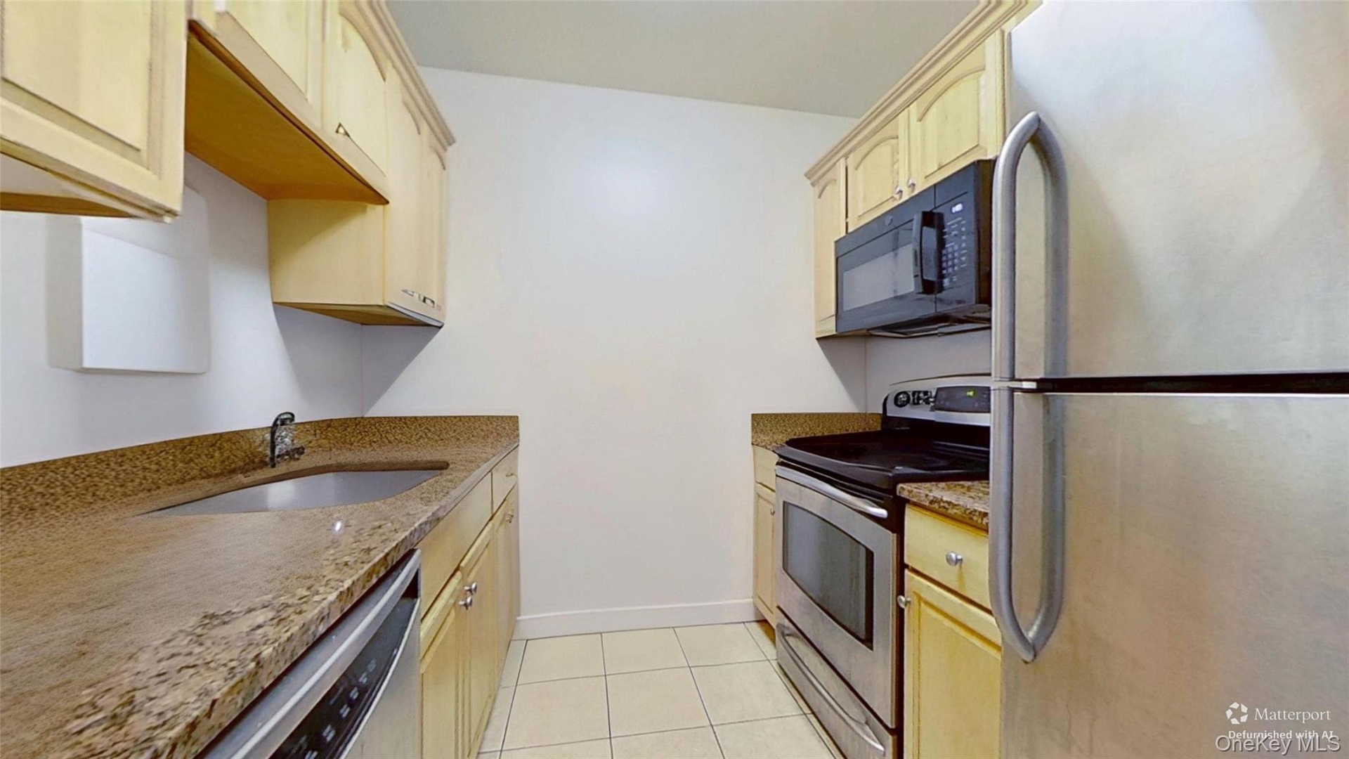 - Kitchen featuring stainless steel appliances, light tile patterned flooring, dark stone countertops, and light brown cabinets