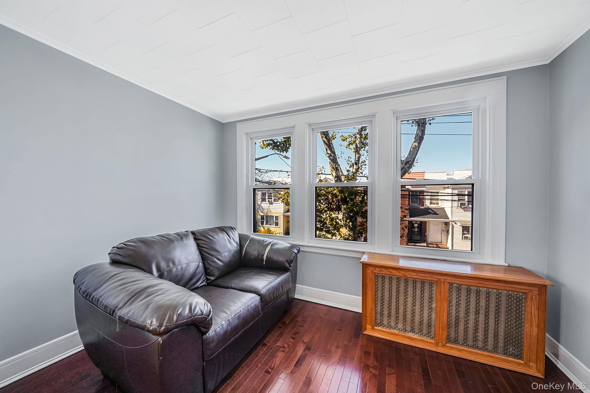 - Sitting room with radiator heating unit, wood finished floors, and ornamental molding
