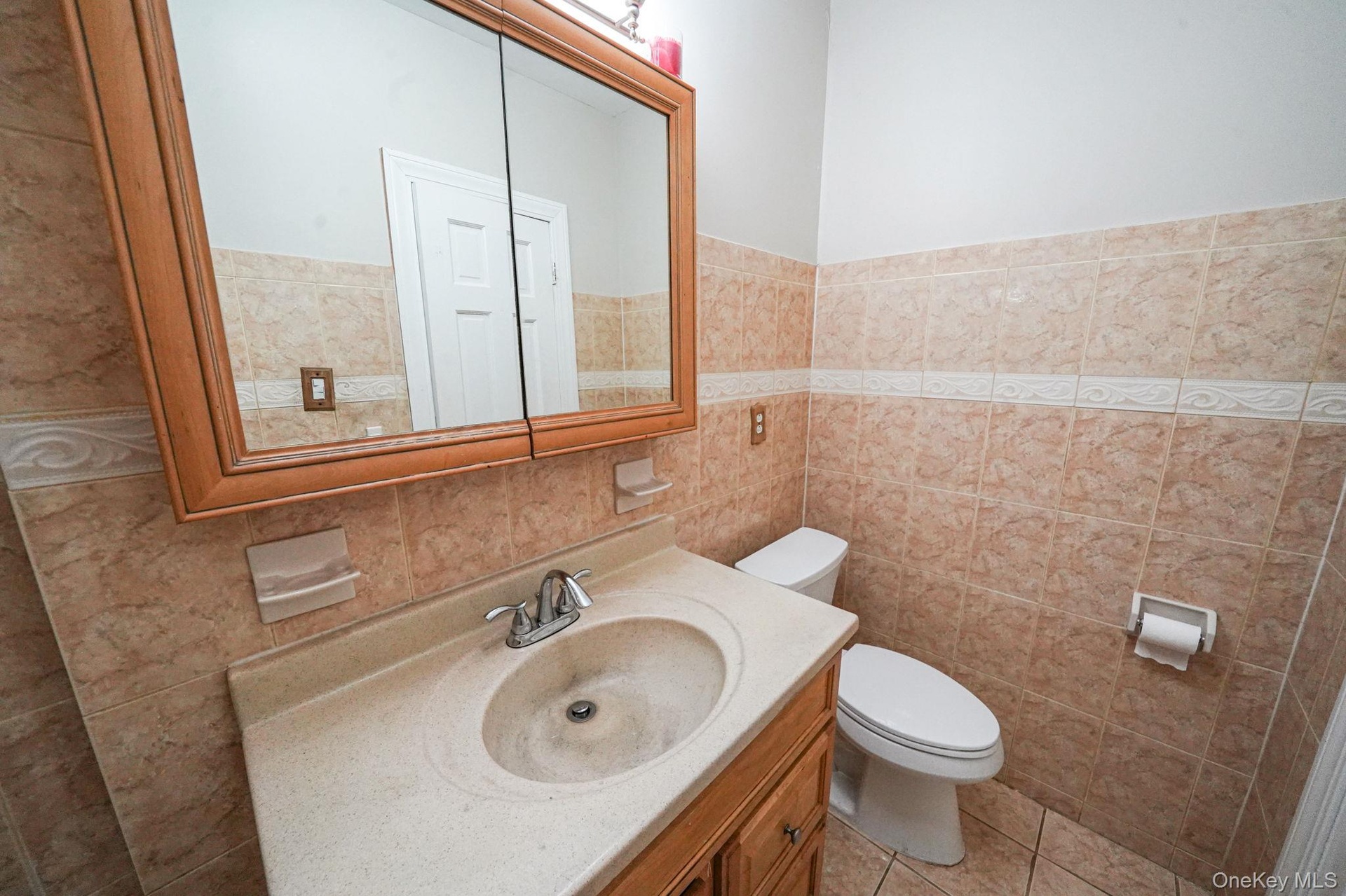 - Half bathroom with vanity, tile walls, light tile patterned floors, and a wainscoted wall