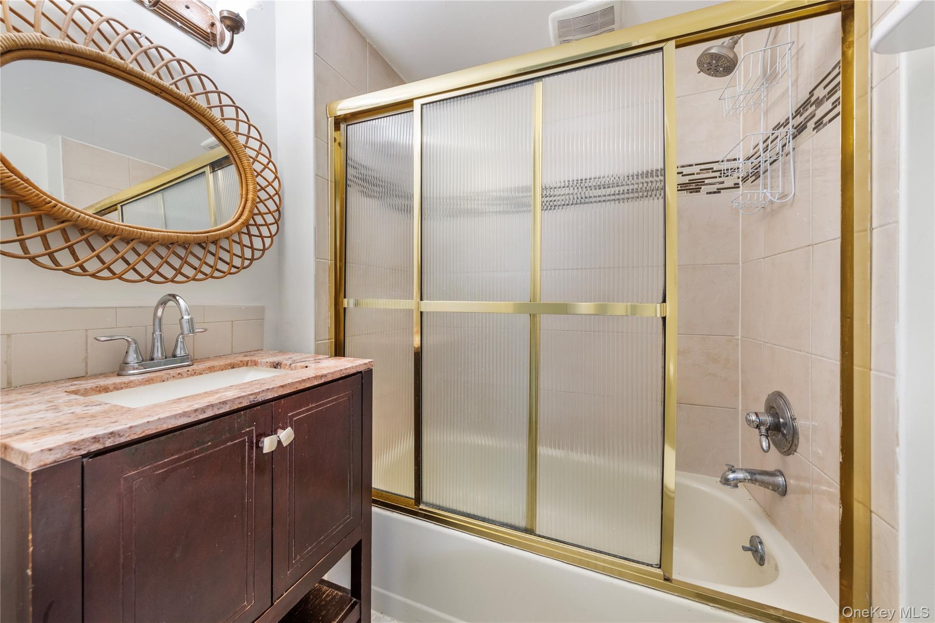 - Full bathroom with vanity, baseboard heating, bath / shower combo with glass door, and plenty of natural light