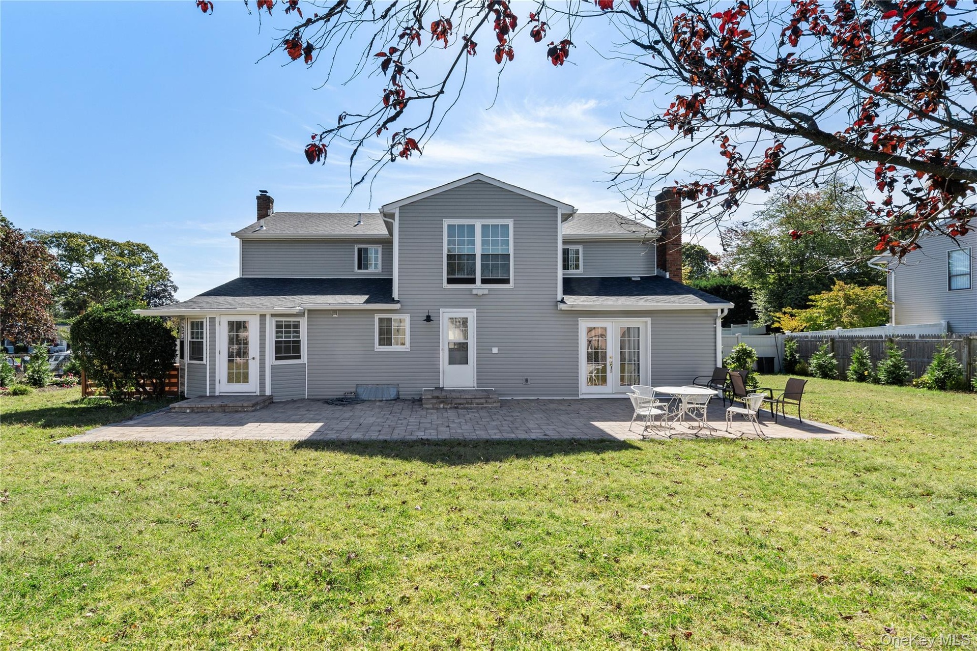 - Rear view of property featuring a chimney, a patio area, a shingled roof, and french doors