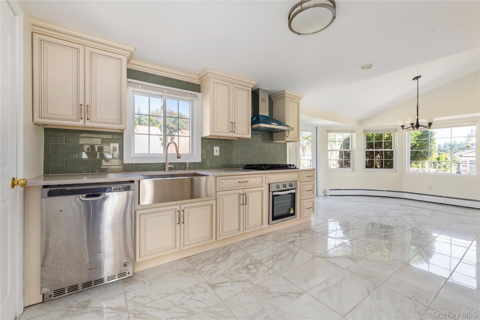 - Kitchen featuring cream cabinetry, backsplash, light marble finish flooring, appliances with stainless steel finishes, and vaulted ceiling