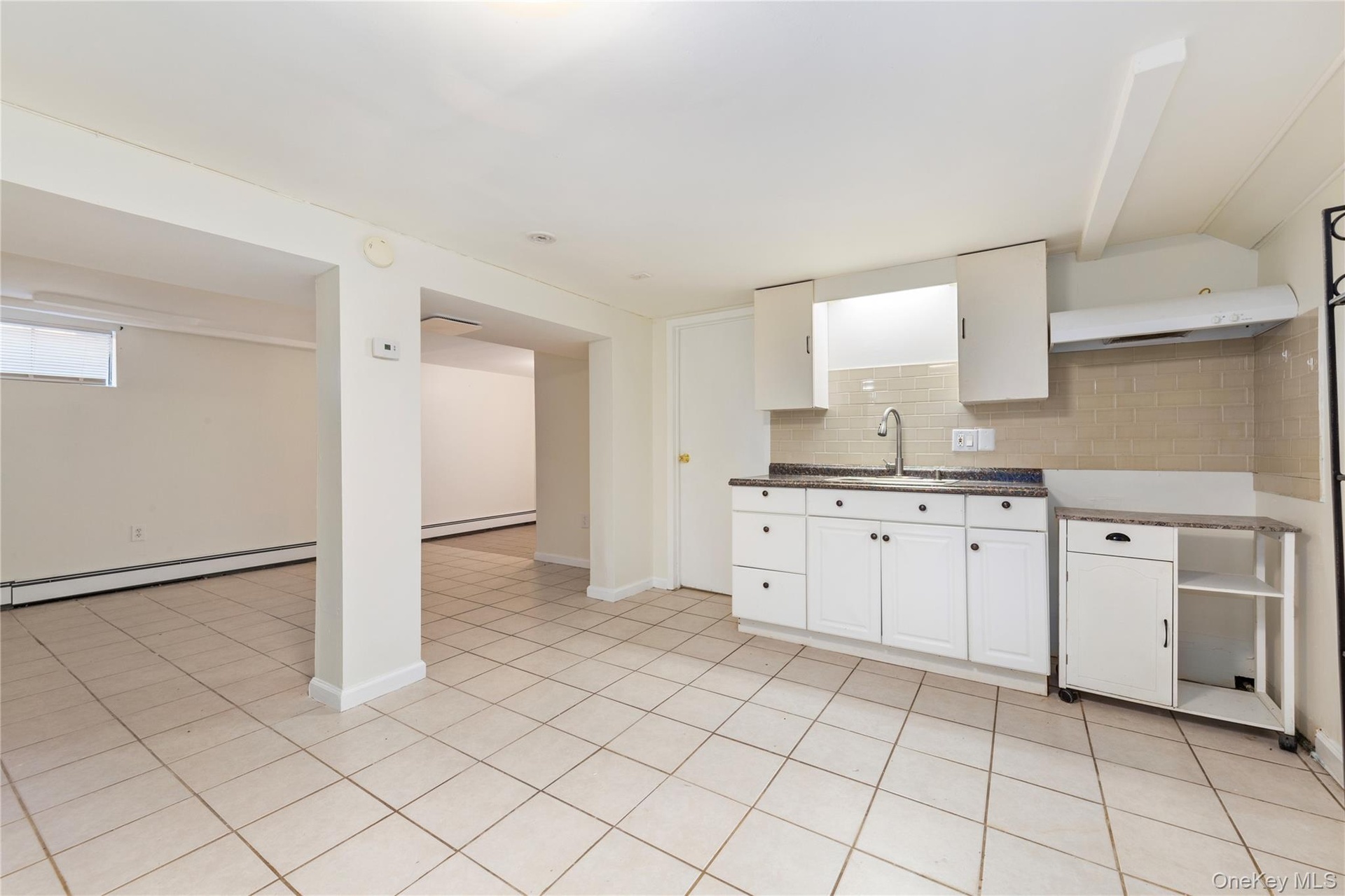 - Kitchen featuring decorative backsplash, white cabinetry, light tile patterned flooring, a baseboard radiator, and beam ceiling