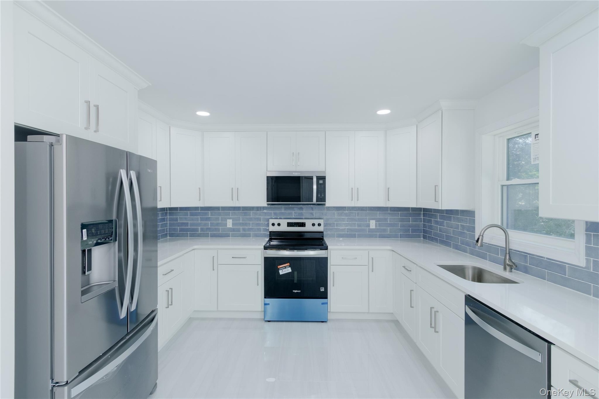 - Kitchen featuring appliances with stainless steel finishes, tasteful backsplash, white cabinetry, and recessed lighting