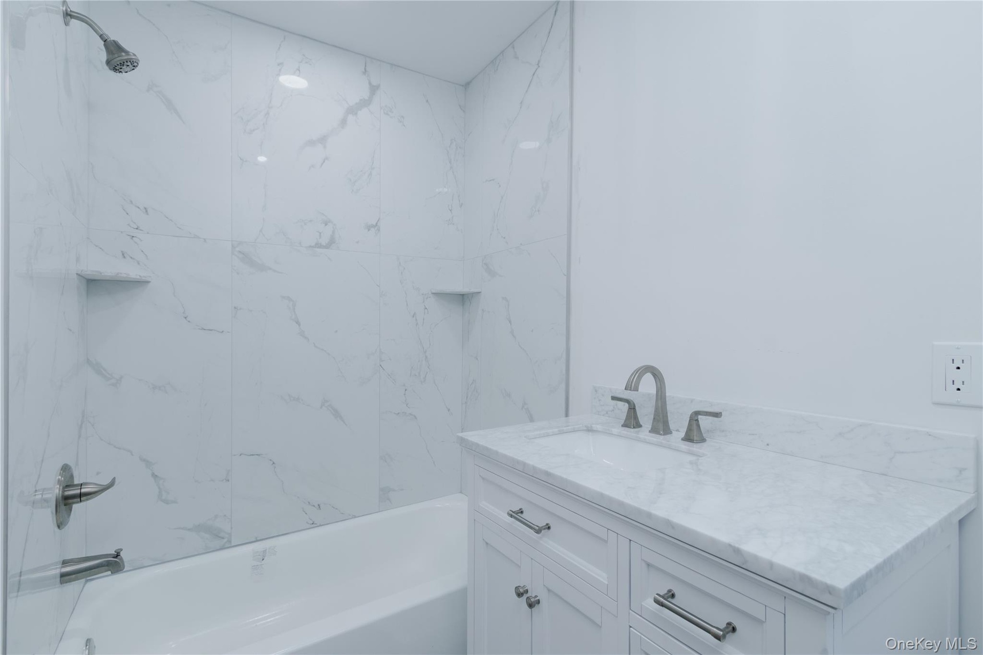 - Kitchen featuring stainless steel appliances, white cabinetry, tasteful backsplash, light stone countertops, and recessed lighting