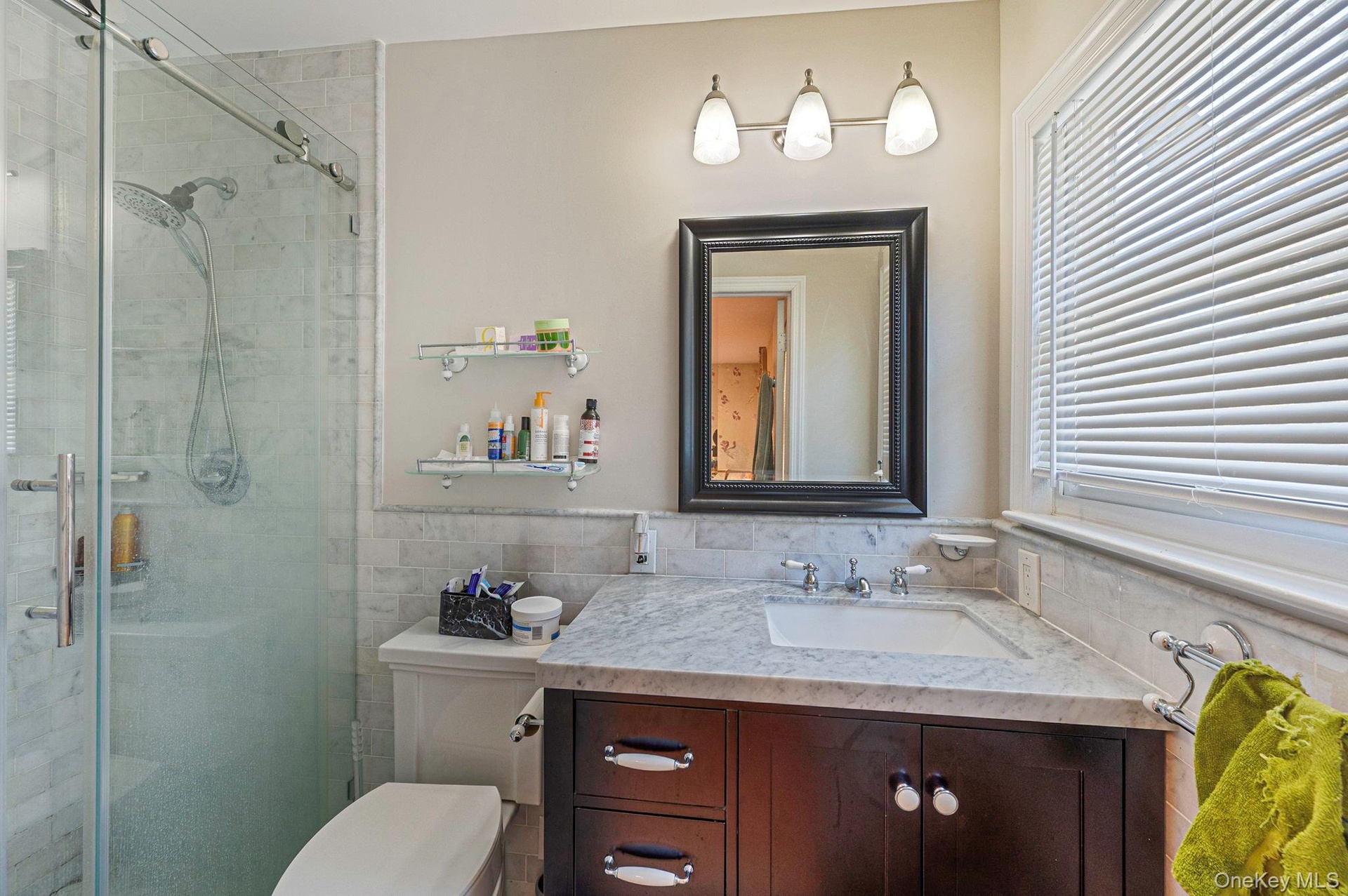 - Full bathroom featuring vanity, a shower stall, and tile walls