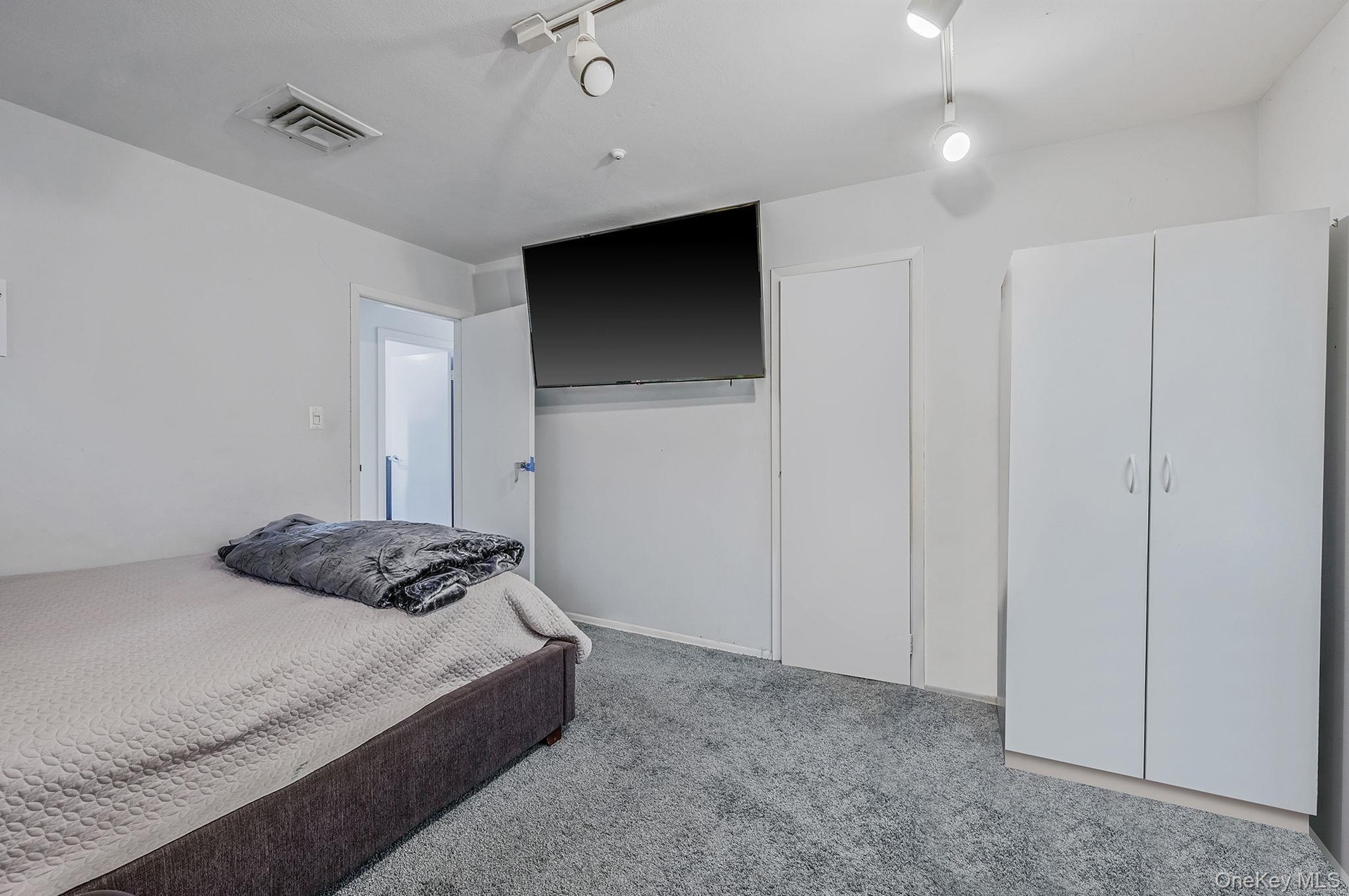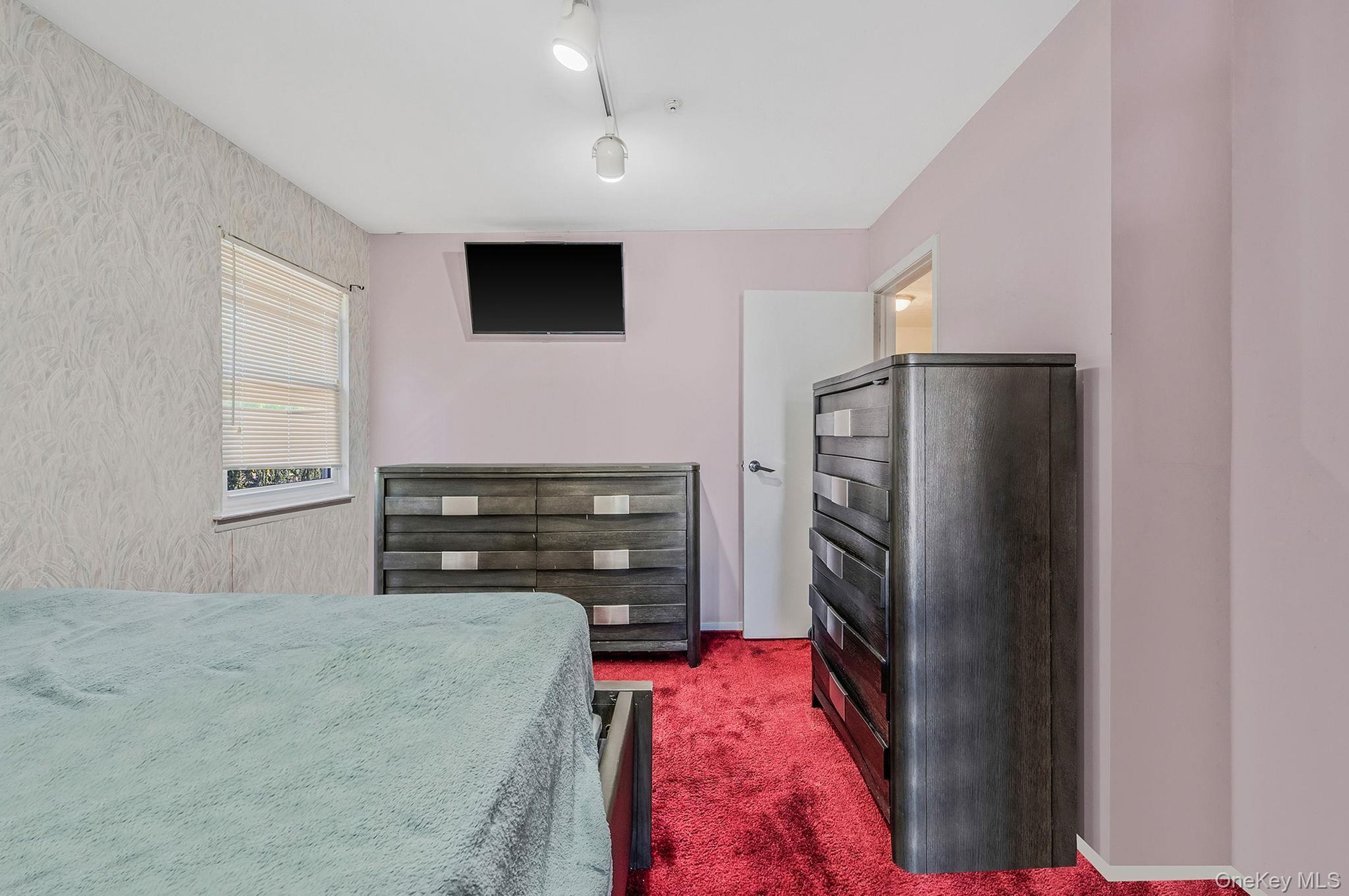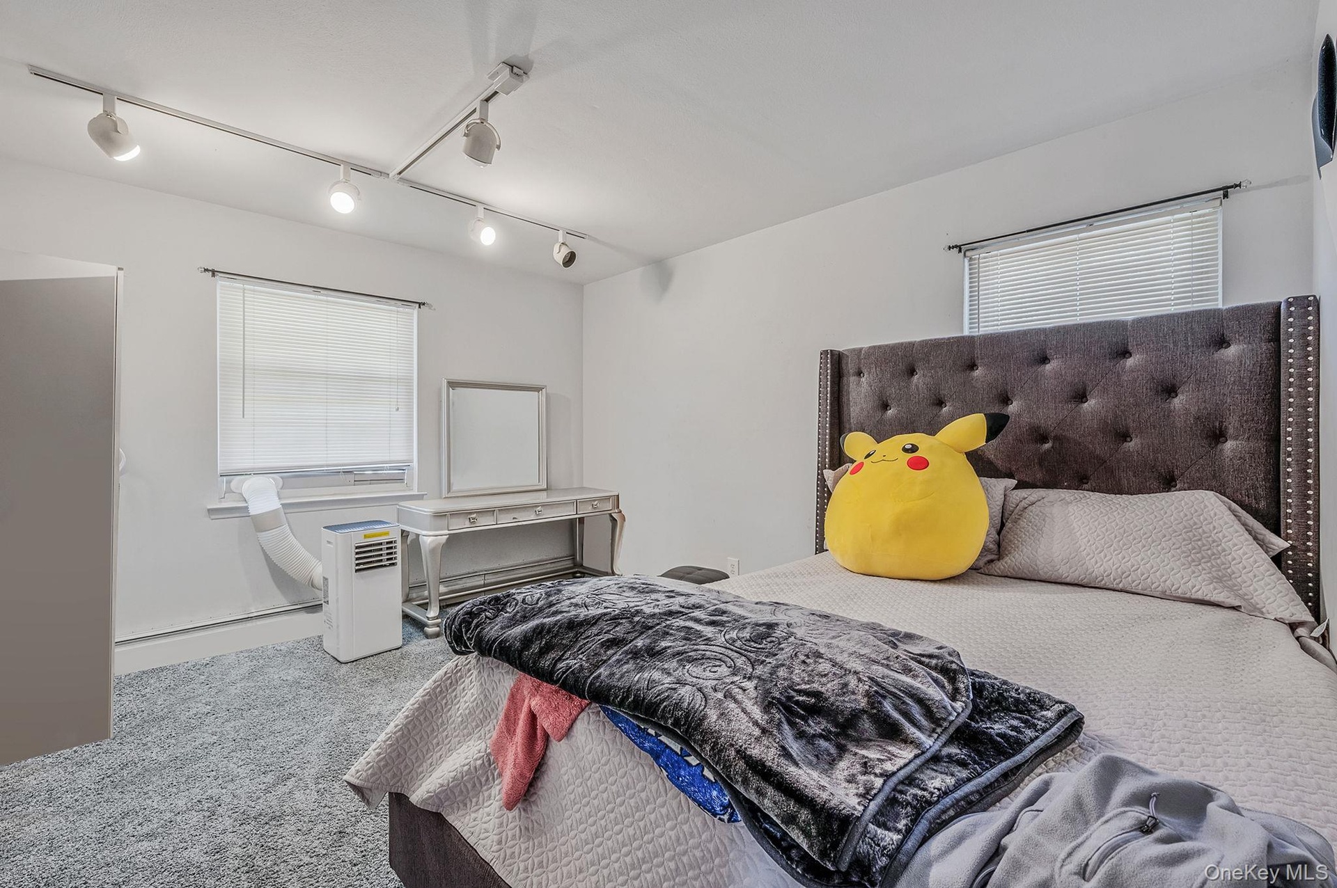 - Carpeted bedroom featuring multiple windows, track lighting, and a baseboard heating unit