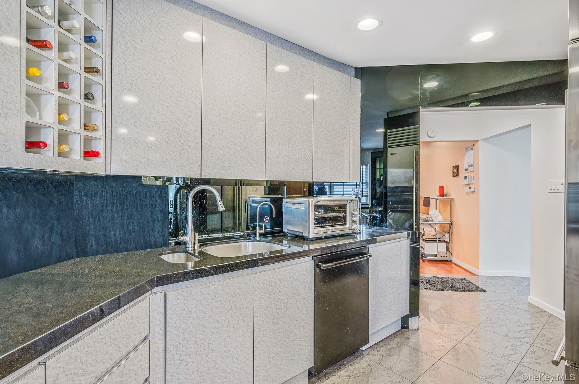 - Kitchen with dishwasher, light marble finish floors, recessed lighting, refrigerator, and dark stone countertops