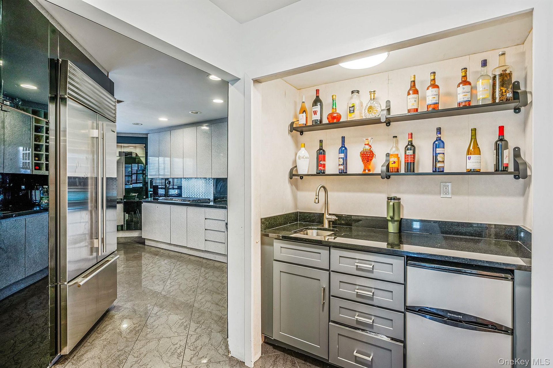 - Indoor wet bar with open shelves, light marble finish flooring, gray cabinets, dark stone countertops, and stainless steel refrigerator