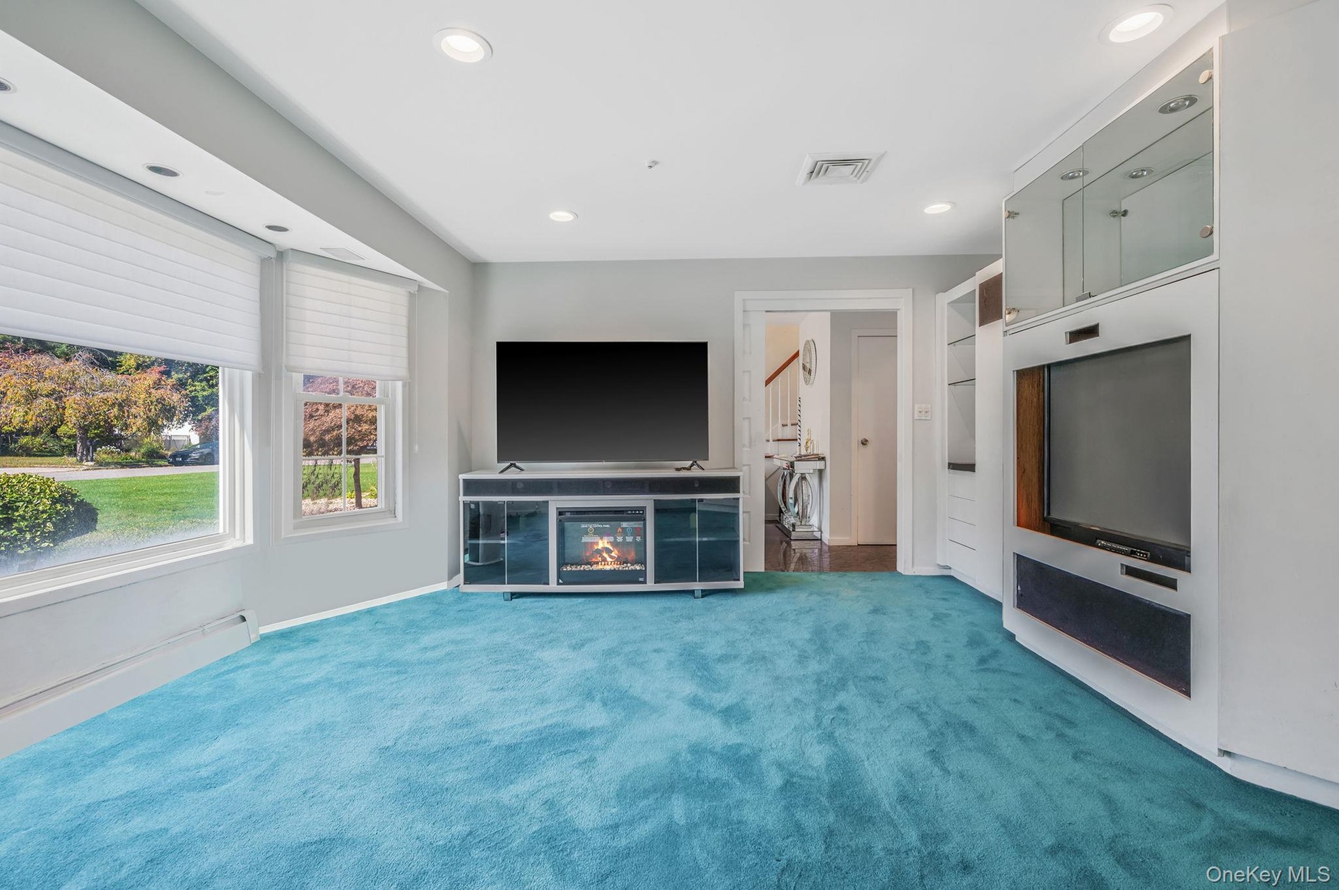 - Unfurnished living room with carpet, recessed lighting, and a glass covered fireplace
